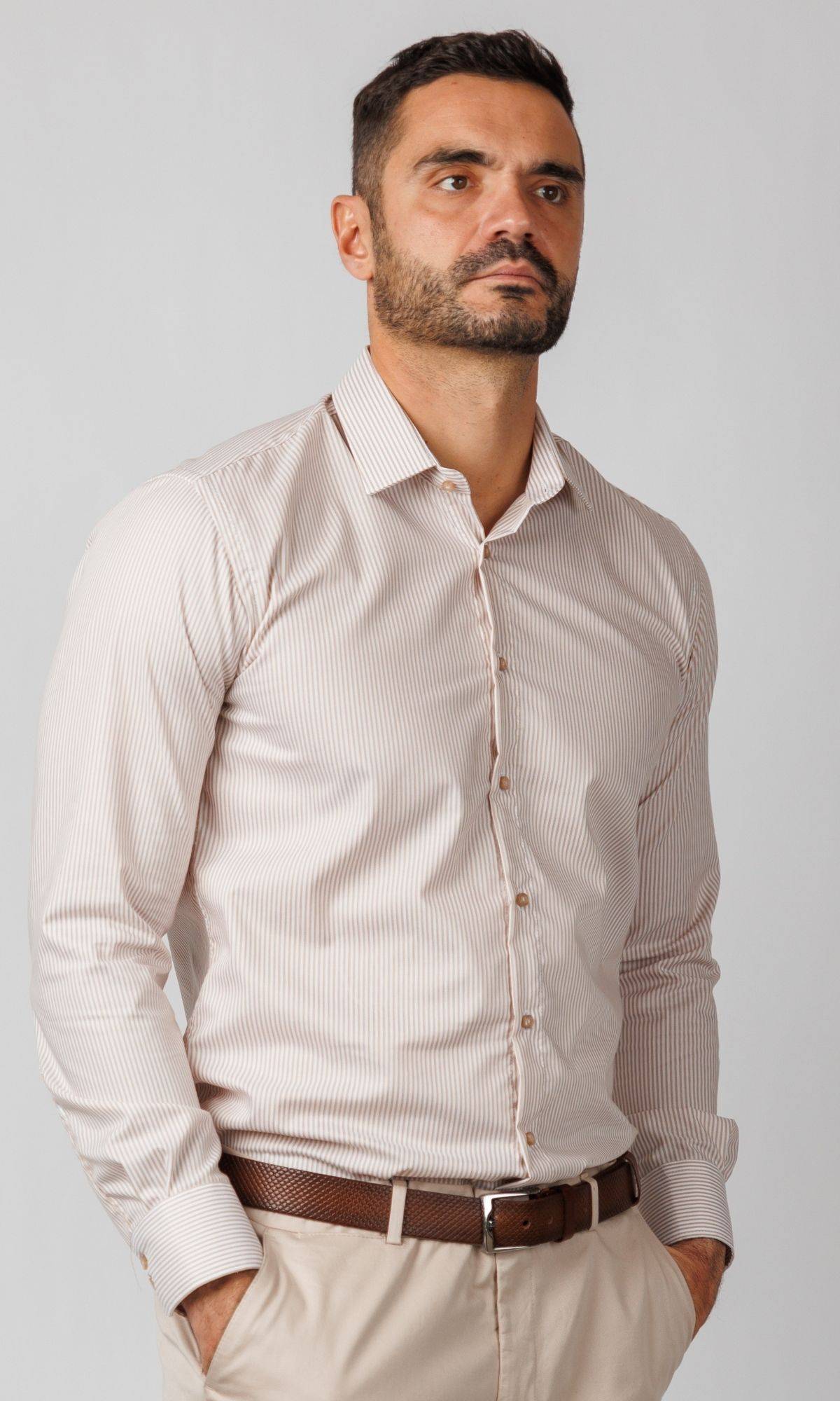 Prefinjena muška košulja iz ATRIUM FASHION kolekcije. Regular fit kroj i nežne bež prugice na krem osnovi čine je savršenom za smart-casual i poslovni stil. Idealna za kombinovanje sa zemljanim tonovima.