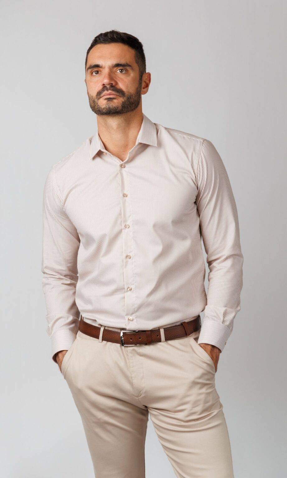 Prefinjena muška košulja iz ATRIUM FASHION kolekcije. Blago strukirani kroj i nežne bež prugice na krem osnovi čine je savršenom za smart-casual i poslovni stil. Idealna za kombinovanje sa zemljanim tonovima.