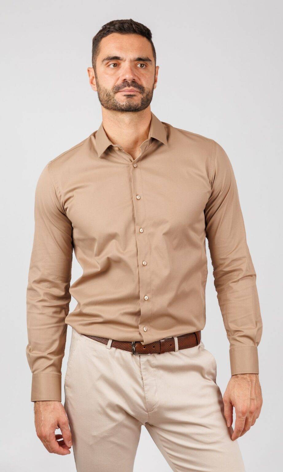 Trendi muška košulja iz ATRIUM FASHION kolekcije u toploj kamel (svetlo braon) nijansi. Slim Fit kroj i jednobojan, gladak materijal čine je idealnom za smart-casual i jesenske kombinacije.