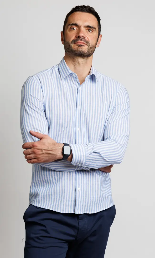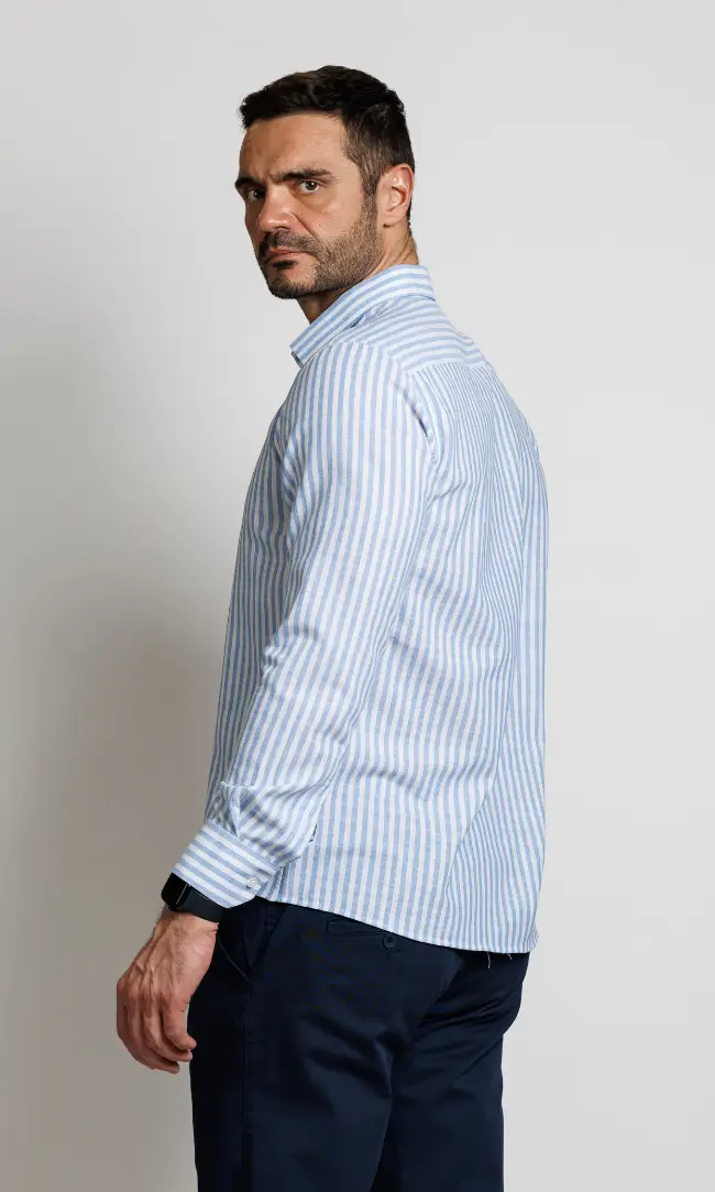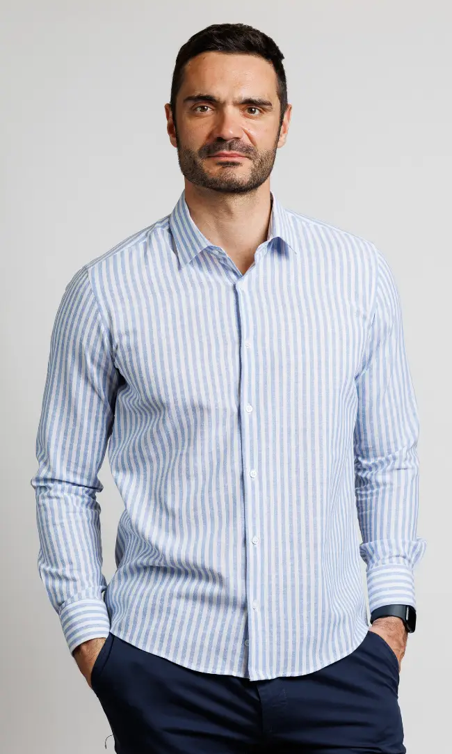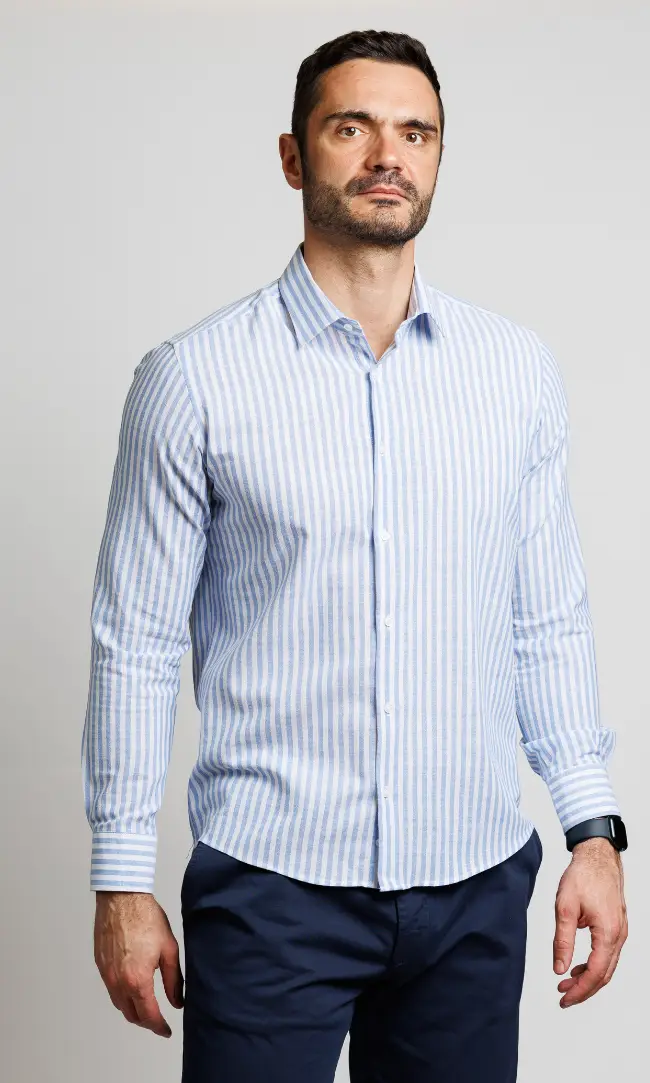 Lanena košulja na pruge – Spoj letnje lakoće i klasičnog stila. Izrađena od 100% prirodnog lana, ova košulja je savršen izbor za vrele dane kada želite da izgledate sređeno, a da vam bude maksimalno udobno.