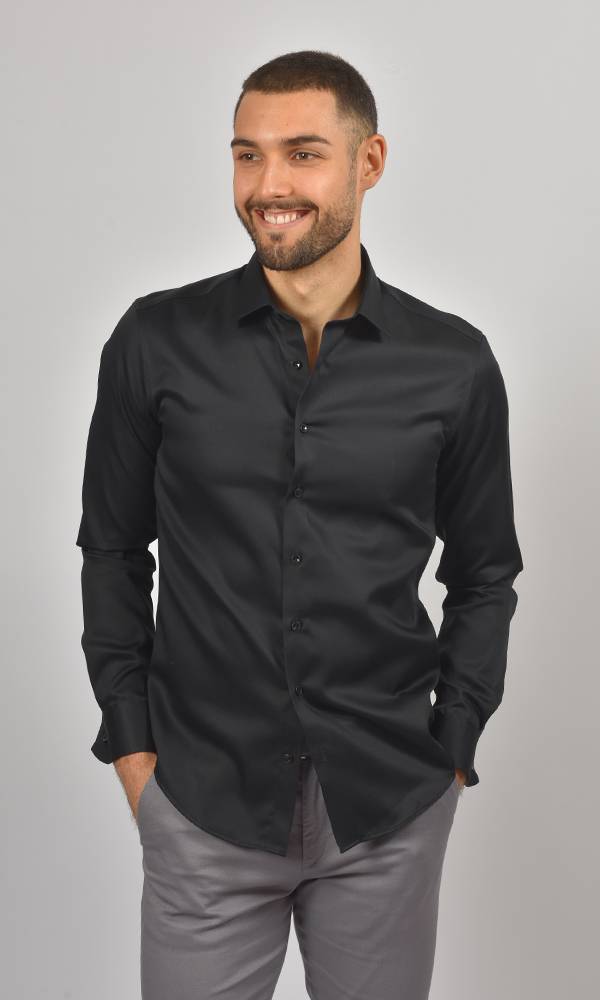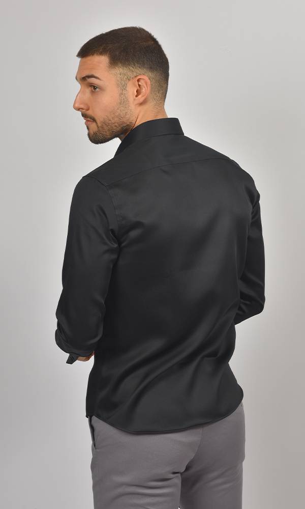 Ova satenska crna košulja sa duplim manžetnama iz kolekcije ATRIUM FASHION je vrhunac luksuzne večernje elegancije. Duboka crna boja, bogati satenski sjaj i manžetne za dugmad čine je obaveznim izborom za svečane večernje događaje, gala prilike i izlaske gde želite da ostavite snažan utisak.