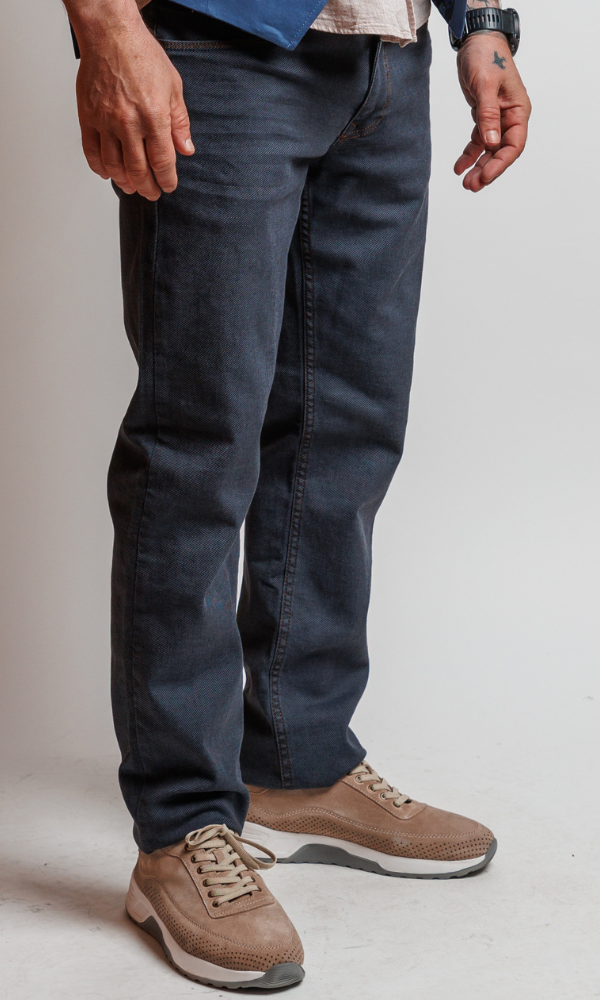 Elegantan muški model pantalona/džinsa iz ATRIUM FASHION kolekcije. Karakteriše ga udoban, ravan kroj i sofisticirana tamnoplava boja sa diskretnom teksturom. Izrađene od mešavine materijala za maksimalan komfor i lako kombinovanje u formalnijim i smart-casual prilikama.