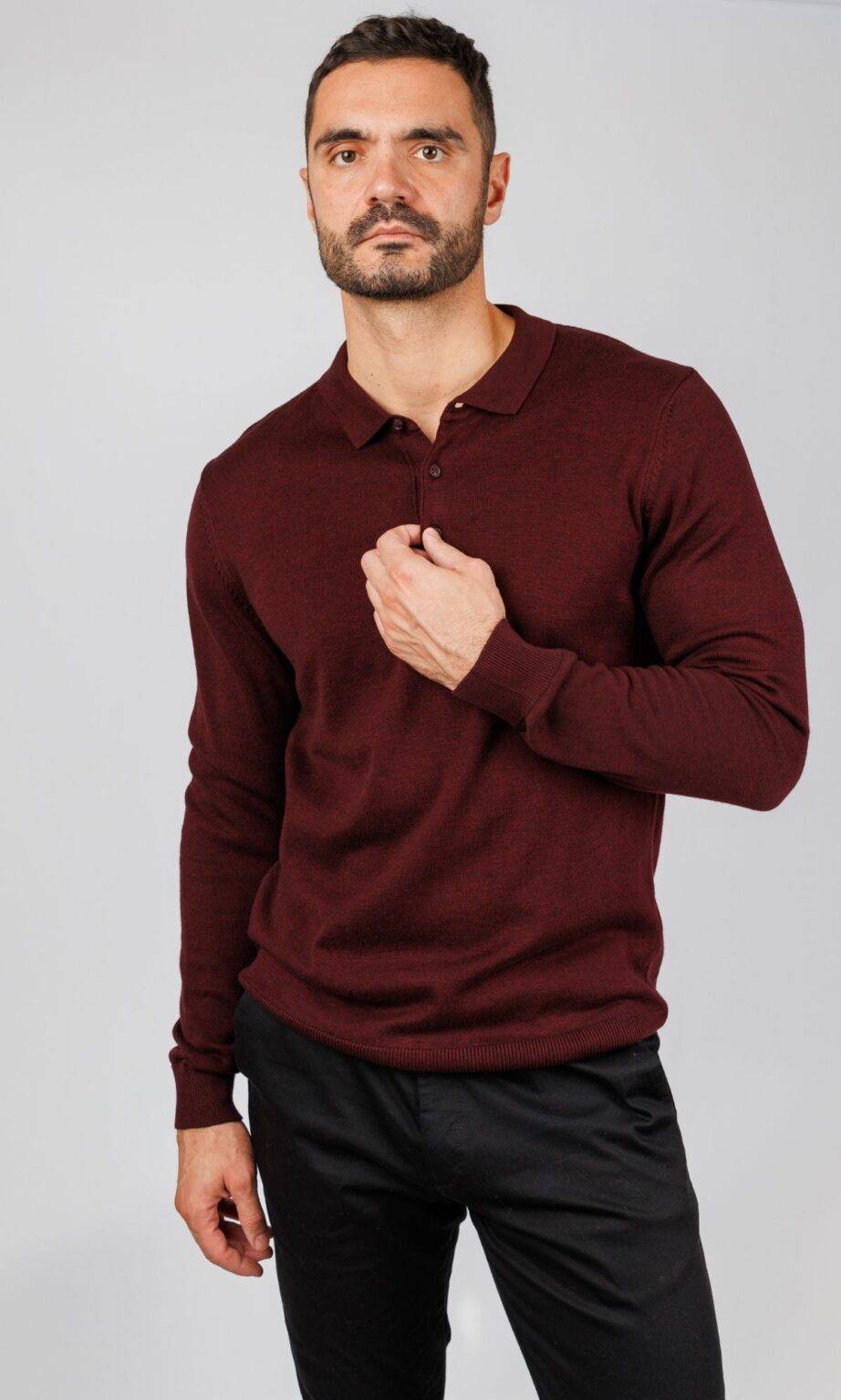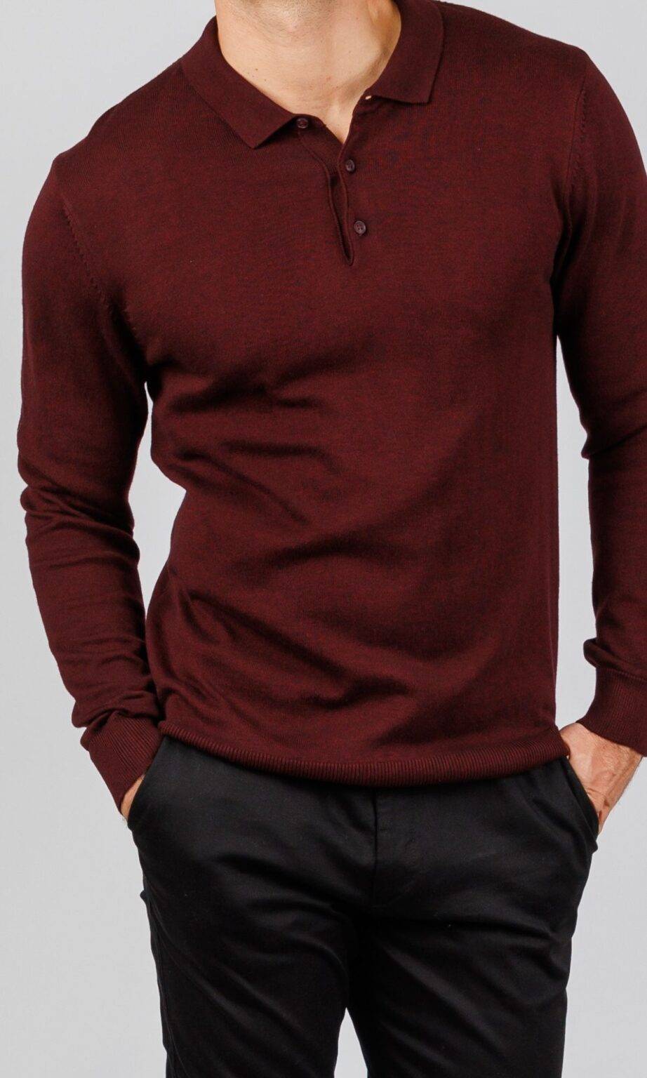 Muška pletena polo majica dugih rukava u bogatoj bordo boji. Klasična kragna i diskretno kopčanje na dugmiće čine je savršenom kombinacijom udobnosti i formalnosti, tipičnom za modernu Atrium Fashion ponudu.