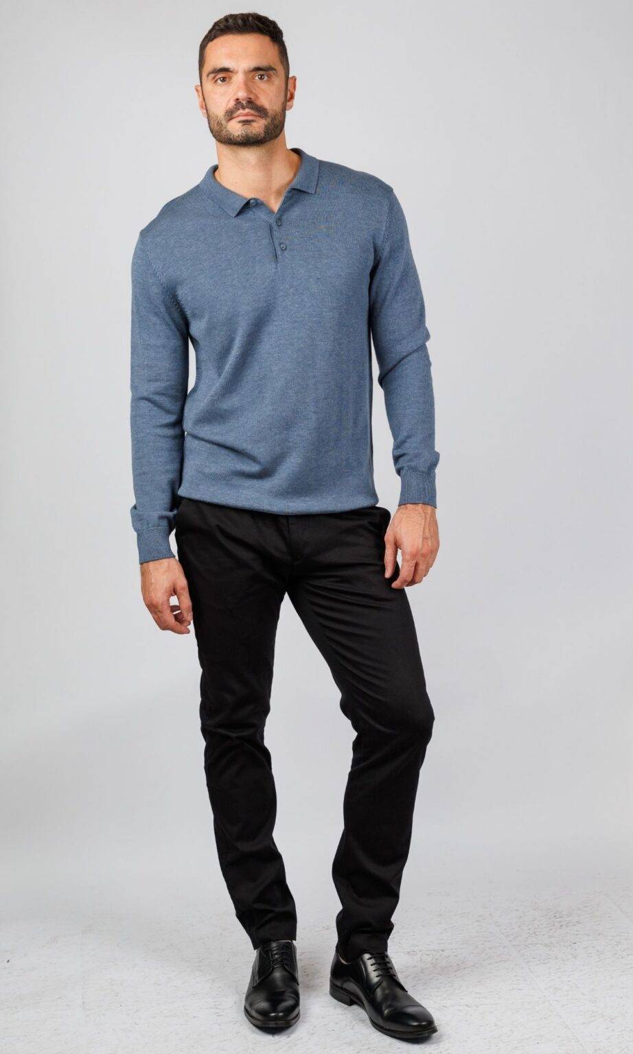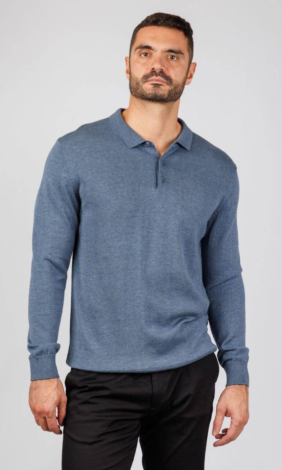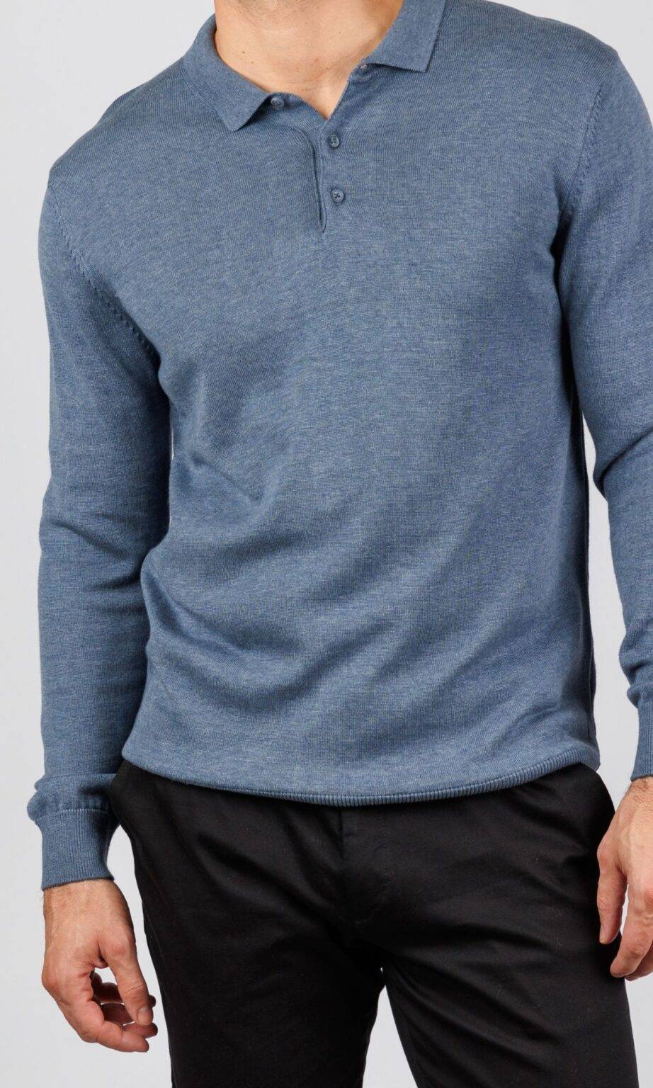 Muška pletena polo majica dugih rukava u prijatnoj svetloplavoj meliranoj boji. Klasična kragna i diskretno kopčanje čine je savršenom bazom za "smart casual" kombinacije, deo prefinjene Atrium fashion selekcije.