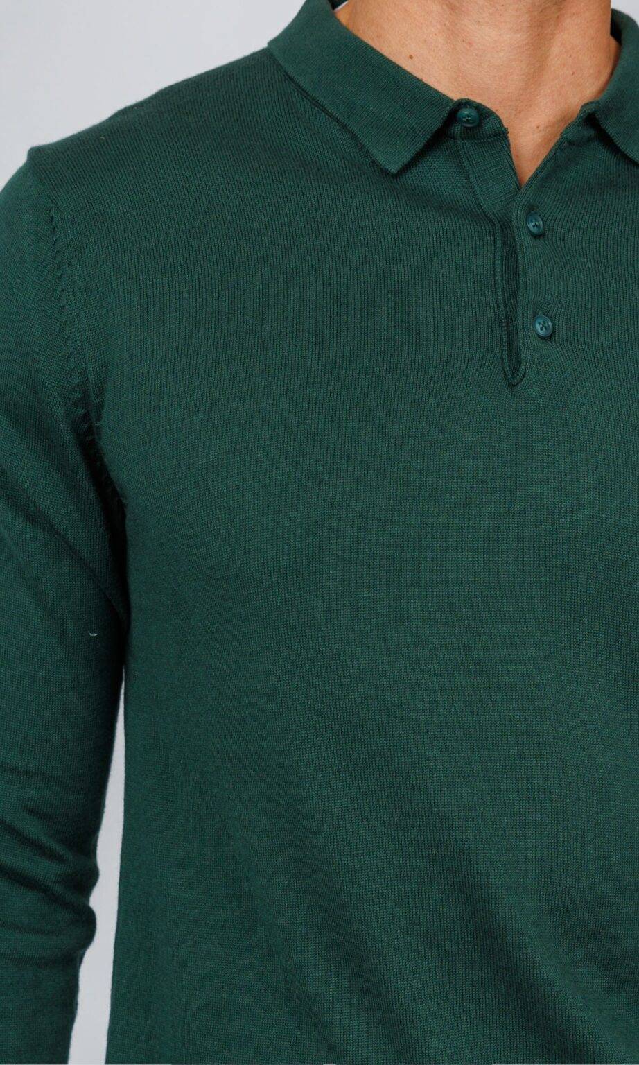 Muška pletena polo majica dugih rukava u bogatoj tamno zelenoj (smaragdnoj) boji. Poseduje klasičnu kragnu i kopčanje na dugmiće. Idealan komad za dodavanje boje i teksture u "smart casual" kombinacije, deo elegantne Atrium Fashion ponude.