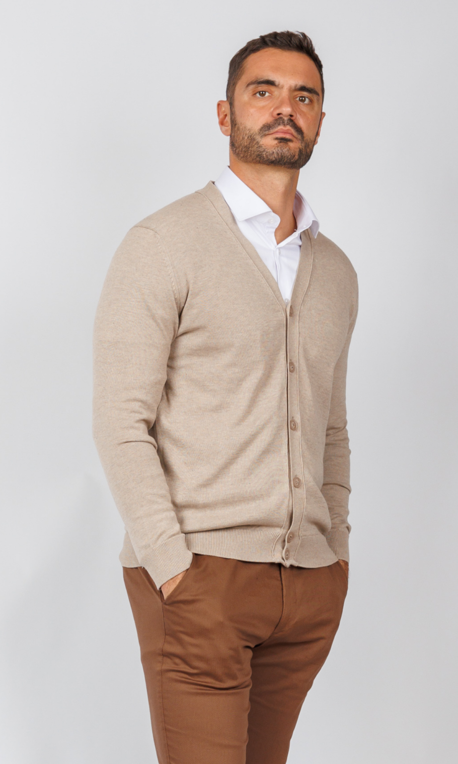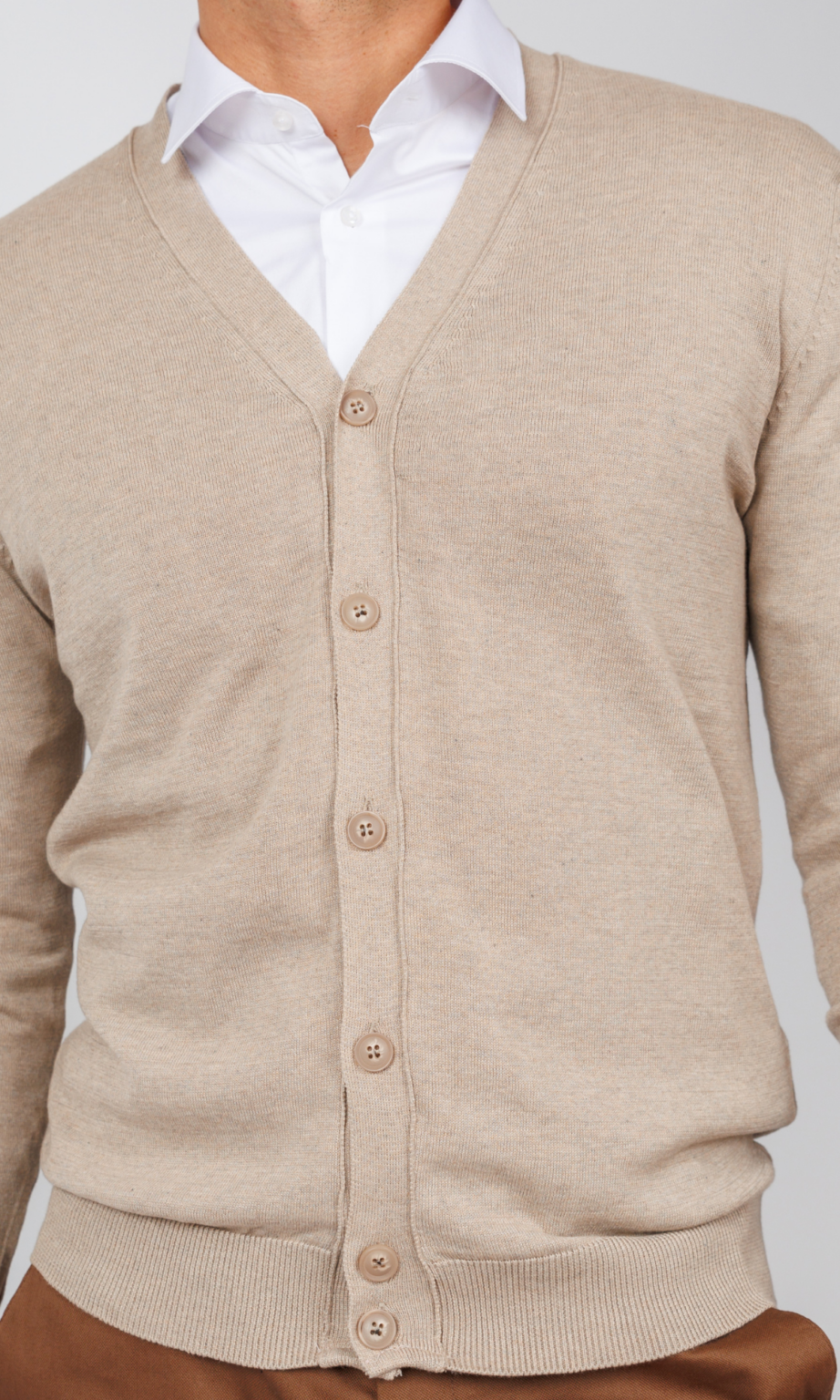 Muški džemper u svetlo bež ili boji peska, sa V-izrezom i kopčanjem na dugmad. Izrađen od glatkog finog pletiva, savršen je neutralni sloj za elegantan, moderan izgled, koji se lako kombinuje sa tamnim i svetlim tonovima.