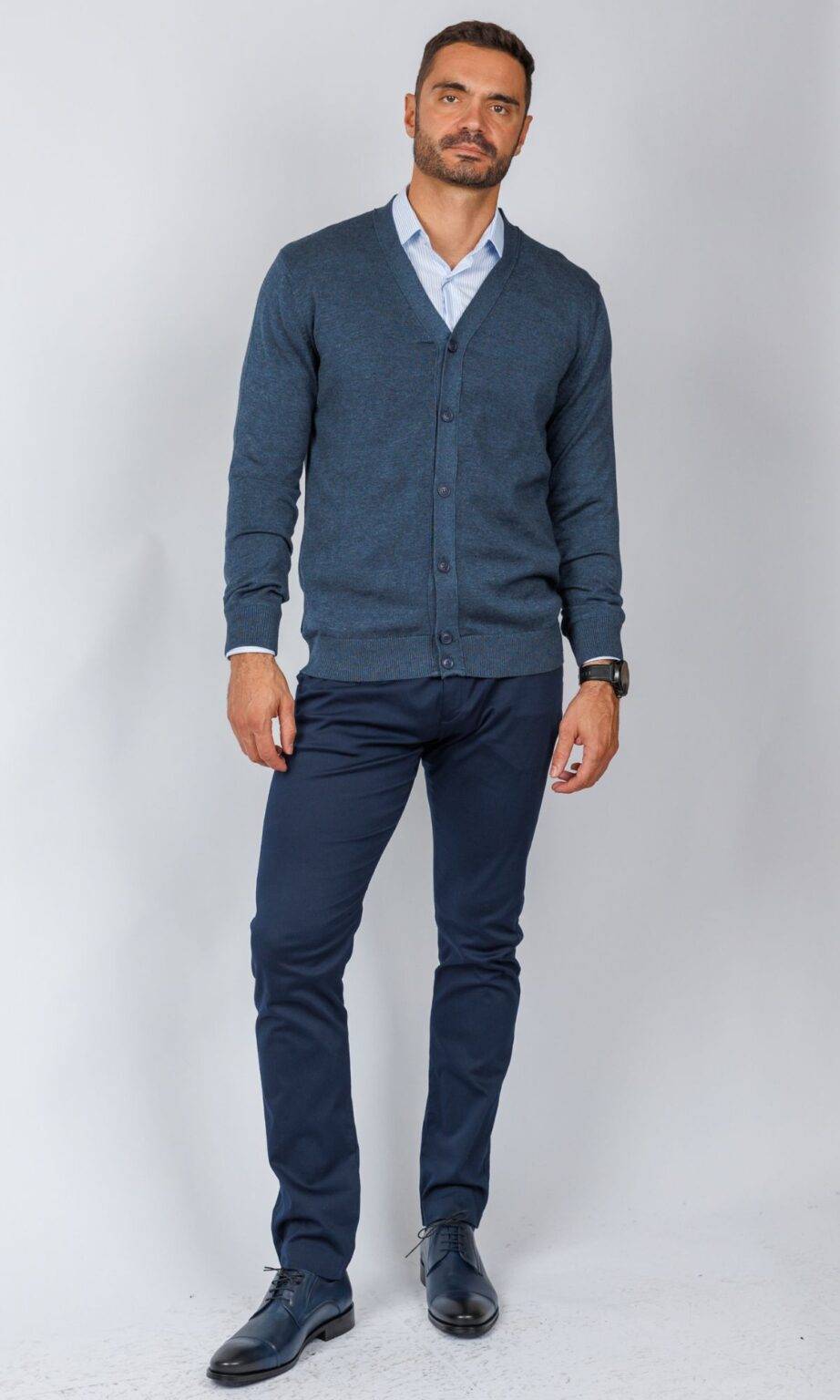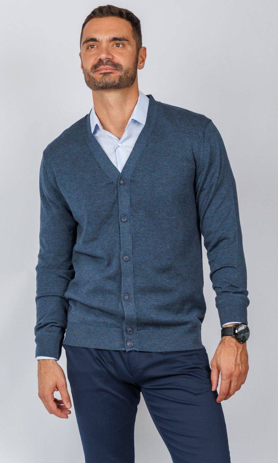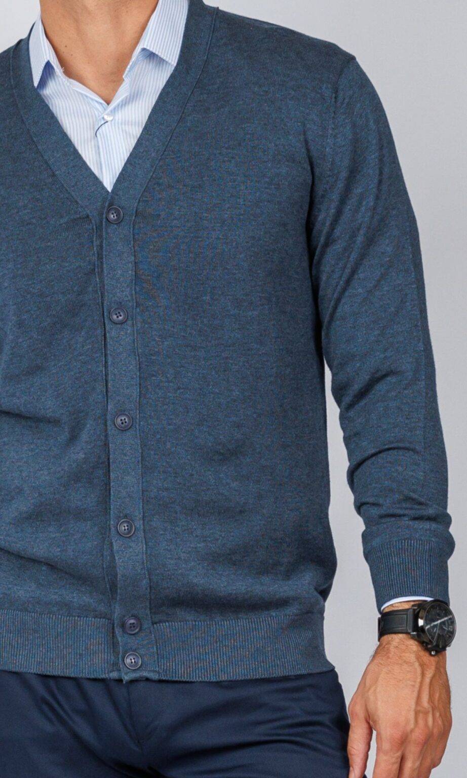 Muški džemper u petrolej/plavo-sivoj boji sa V-izrezom i kopčanjem dugmadima. Ovaj model finog pletiva ima blagi melanž efekat, nudeći sofisticiranu alternativu klasičnoj teget boji, savršen za smart-casual kombinacije.