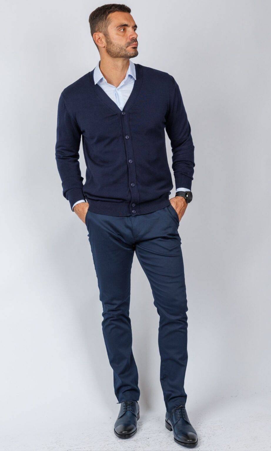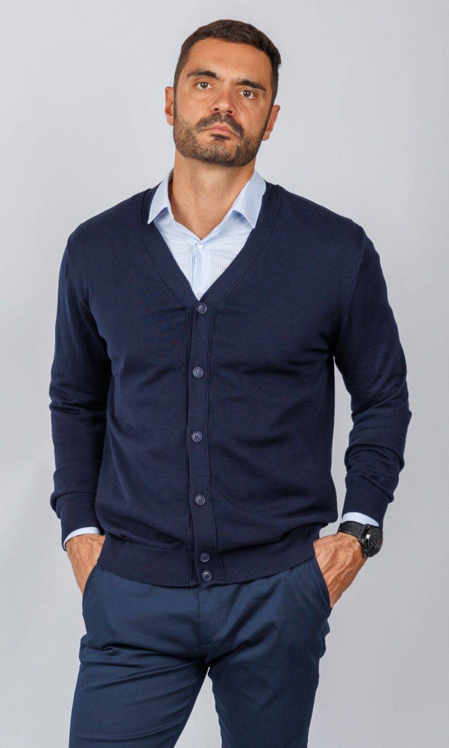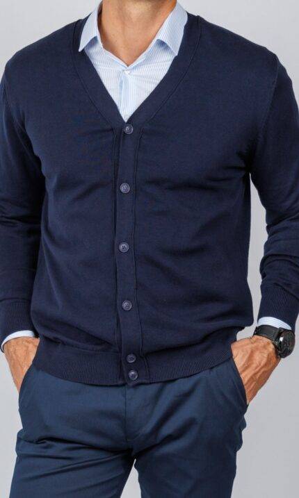 Muški teget džemper sa V-izrezom i kopčanjem na dugmad. Izrađen je od finog pletiva, idealan za slojevito oblačenje preko košulje za postizanje elegantnog poslovnog ili smart-casual izgleda.