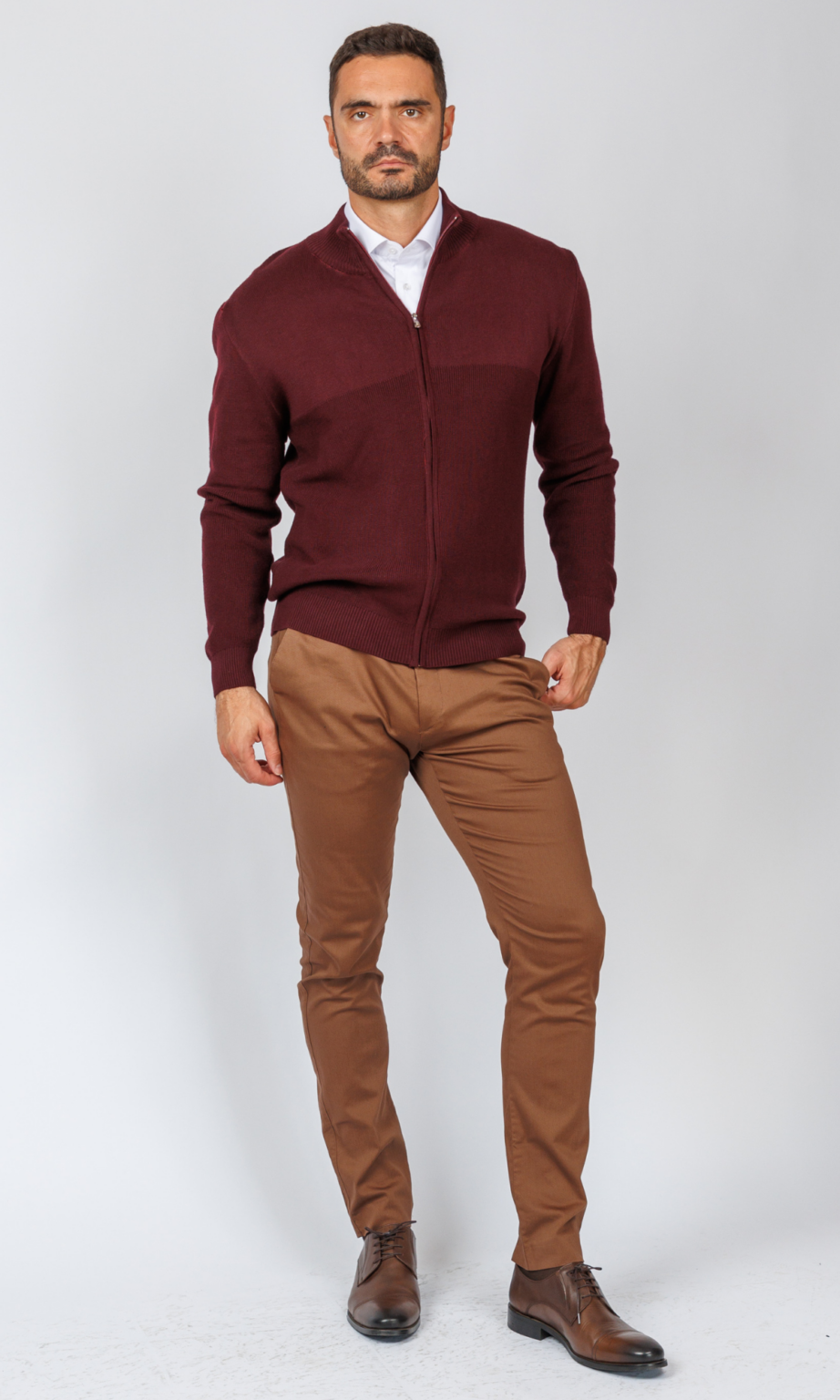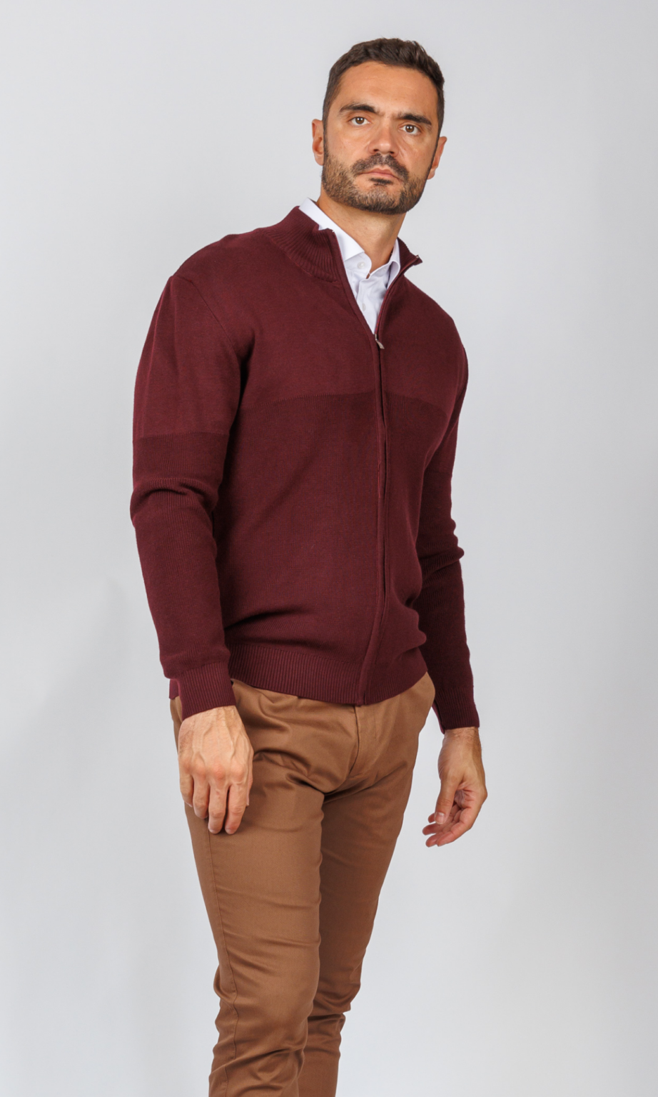 Muški džemper na puni zip u bogatoj bordo boji. Odlikuje se uspravnom kragnom i reljefnom pleteninom na gornjem delu, što je čini idealnim izborom za slojeviti "smart casual" stil, deo atraktivne Atrium Fashion ponude.