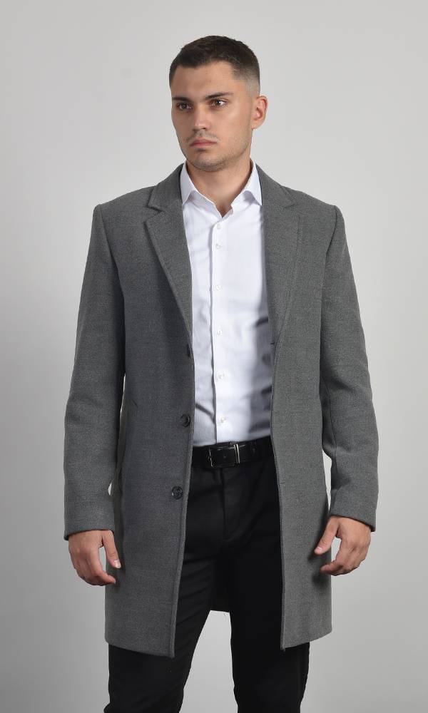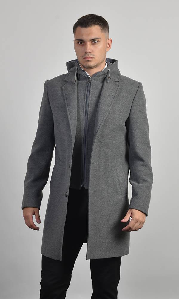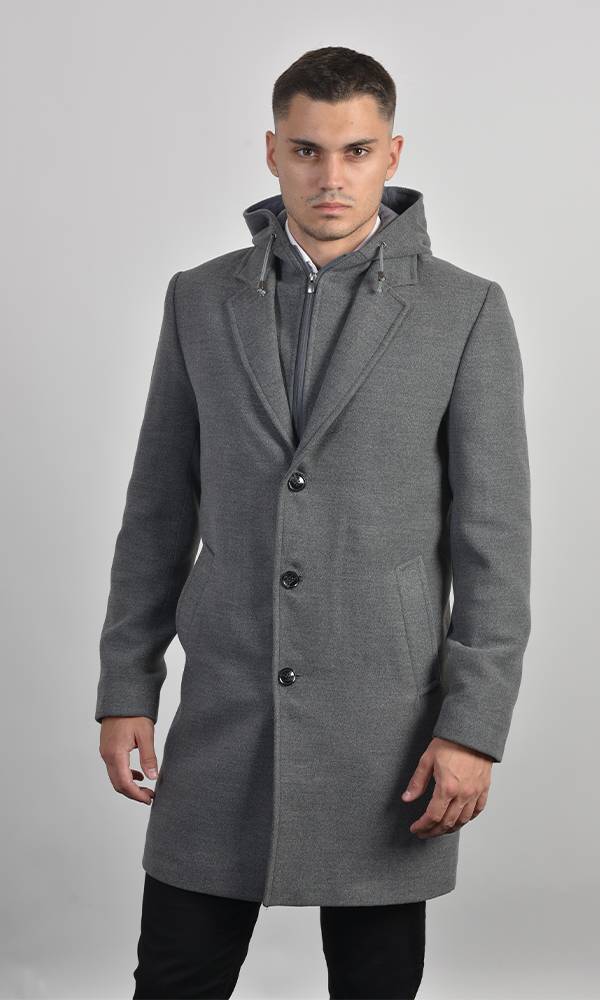 Muški kratki kaput u sivoj boji sa uklonjivim unutrašnjim umetkom na zip i kapuljačom. Izrađen od vunene mešavine sa klasičnom rever-kragnom. Savršen za slojevito oblačenje, kombinuje formalnost i udobnost kežual stila, deo Atrium fashion kolekcije.