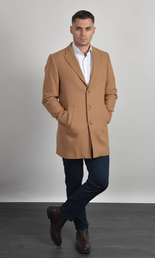 Muški kratki kaput u luksuznoj boji kamel/kamila. Klasičan kroj sa rever-kragnom i centralnim kopčanjem. Izrađen od vunene mešavine, idealan je za dodavanje svetlog akcenta i prefinjenosti zimskom stilu, deo premium Atrium Fashion kolekcije.