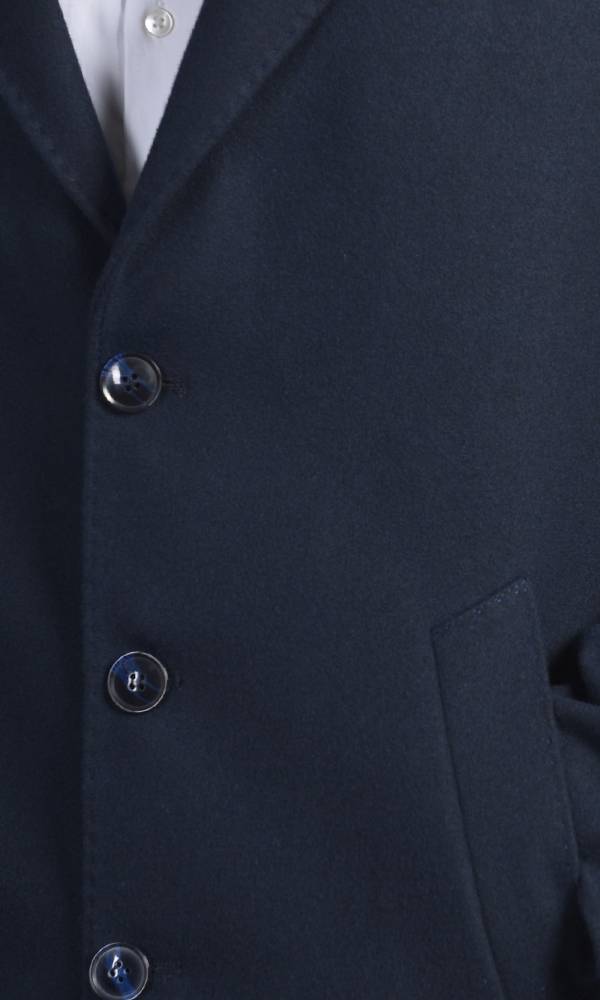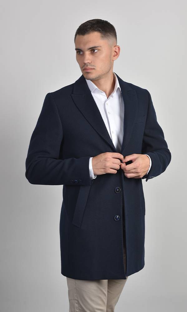 Muški kratki kaput u teget boji. Klasičan kroj sa rever-kragnom i centralnim kopčanjem. Izrađen od vunene mešavine, idealan je za dodavanje prefinjenosti zimskom stilu, deo premium Atrium Fashion kolekcije.