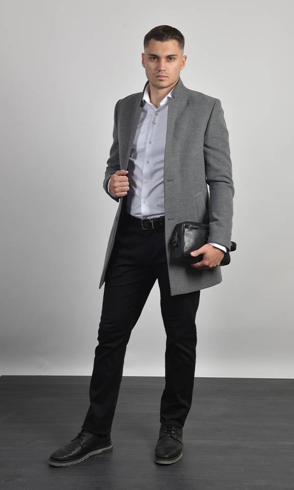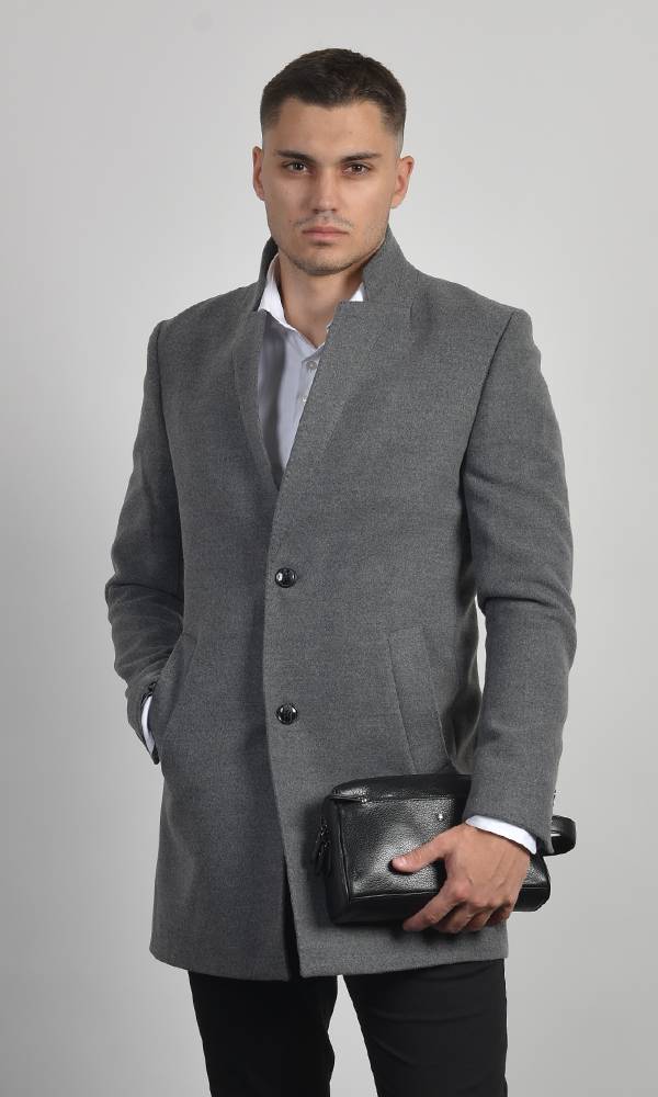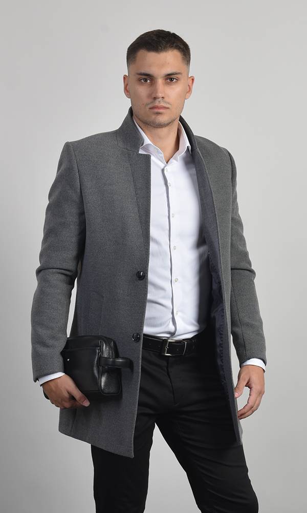 Elegantan muški kratki kaput u sivoj boji, izrađen od vunenog/meliranog materijala. Odlikuje ga moderna uspravna kragna i jednostavno kopčanje na dugmad. Idealan za slojevito poslovno i svečano oblačenje, deo premium Atrium Fashion ponude.