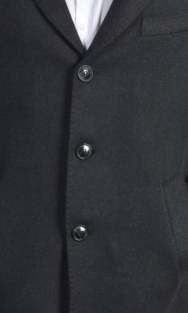 Muški dugački kaput (do kolena/listova) u tamno sivoj boji, sa klasičnom preklopljenom (košuljnom) kragnom i skrivenim kopčanjem. Izrađen od vunene mešavine, pruža izuzetnu eleganciju i toplinu za formalne i poslovne prilike, deo premium Atrium fashion ponude.