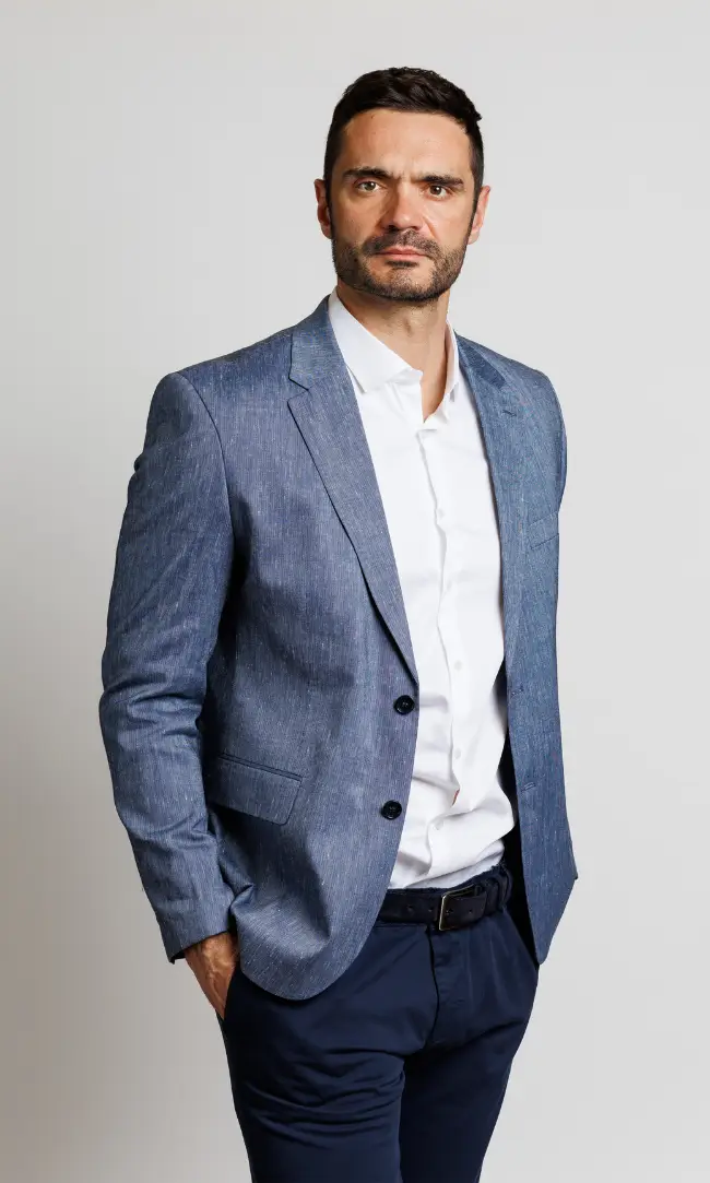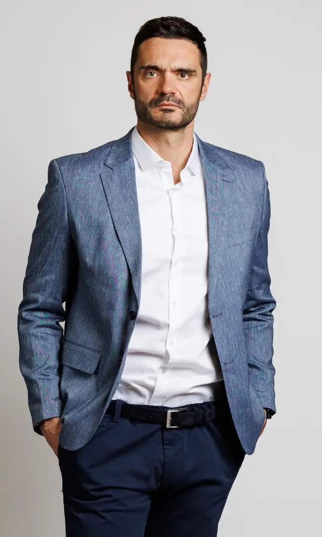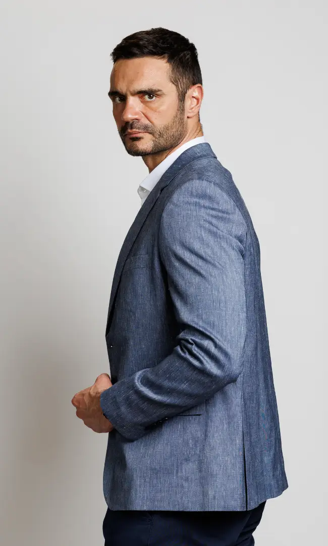 Muški laneni sako u plavoj boji.Elegantan i lagan, ovaj sako od vrhunskog lana je savršen izbor za letnje događaje i smart-casual kombinacije. Prirodni materijal omogućava koži da diše, dok strukirani kroj osigurava moderan izgled.