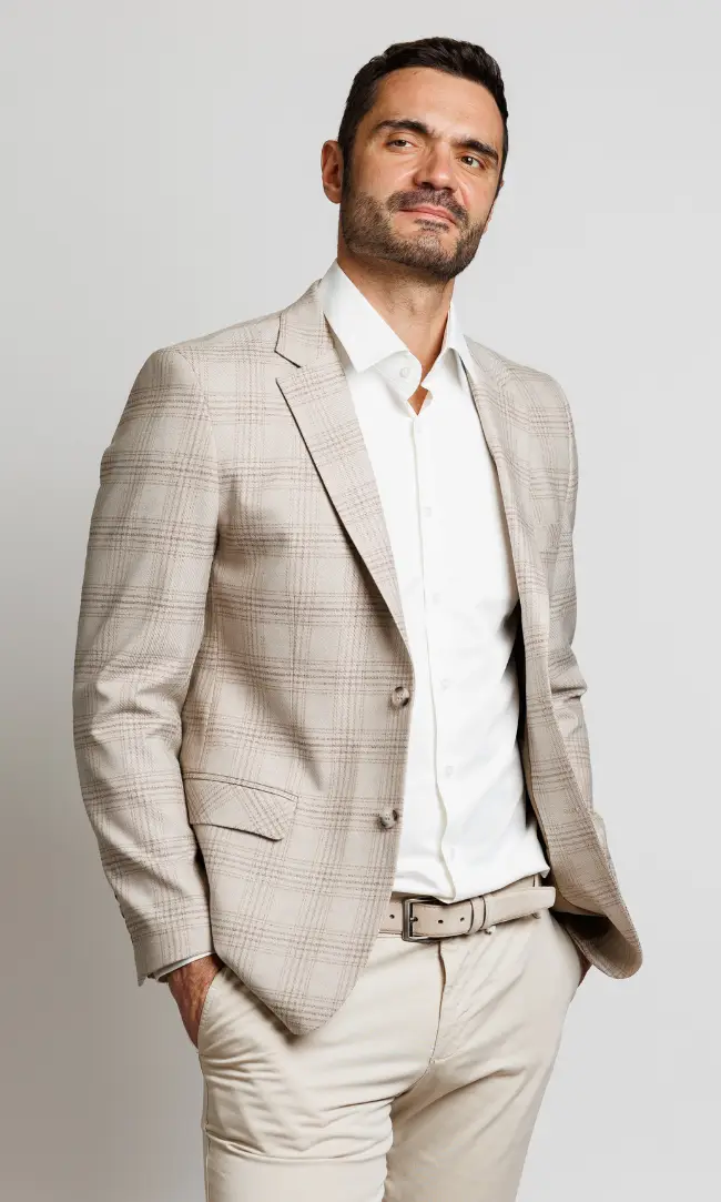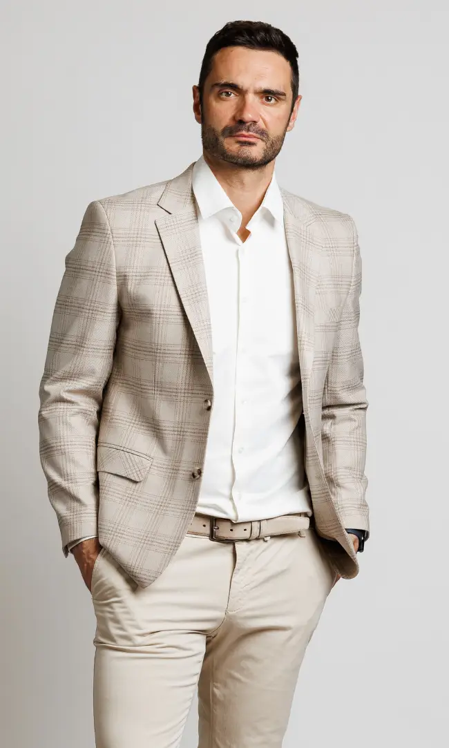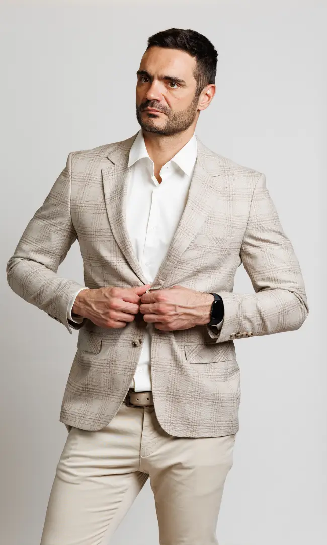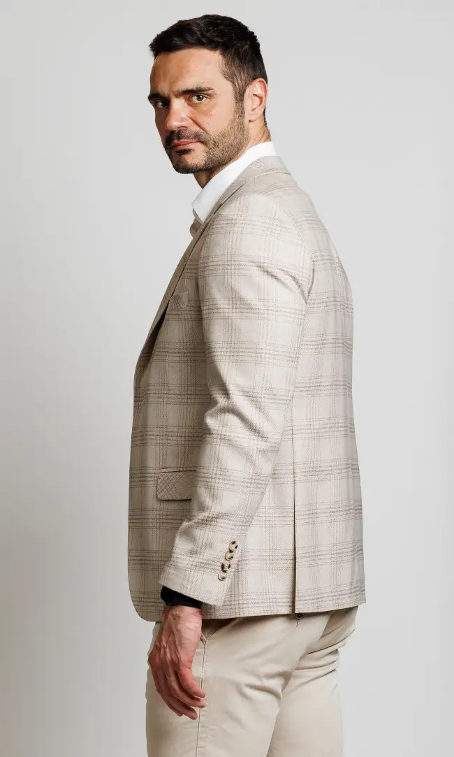 Elegantan muški sako u svetlo bež nijansi sa suptilnim kariranim dezenom. Idealan za poslovne prilike, venčanja na otvorenom ili formalne večere gde želite da ostavite utisak prefinjenosti i lakoće.