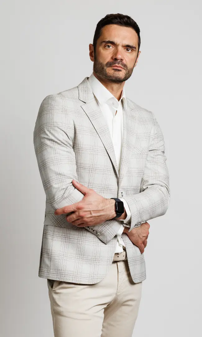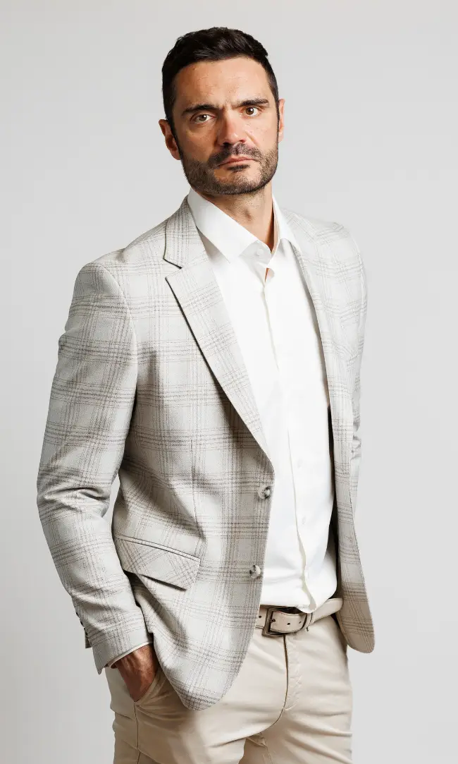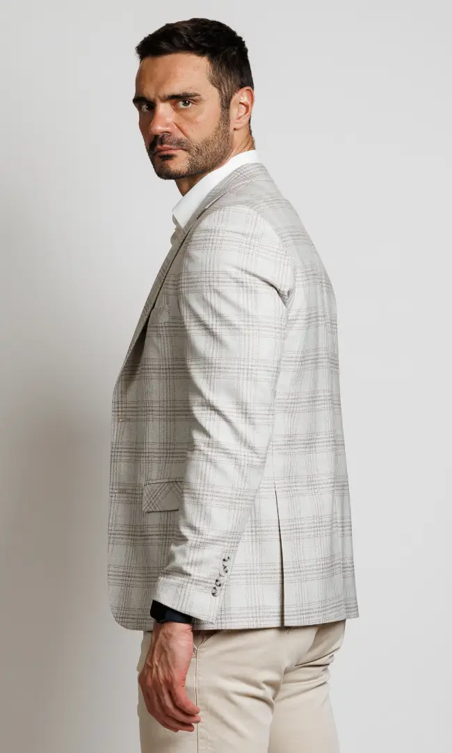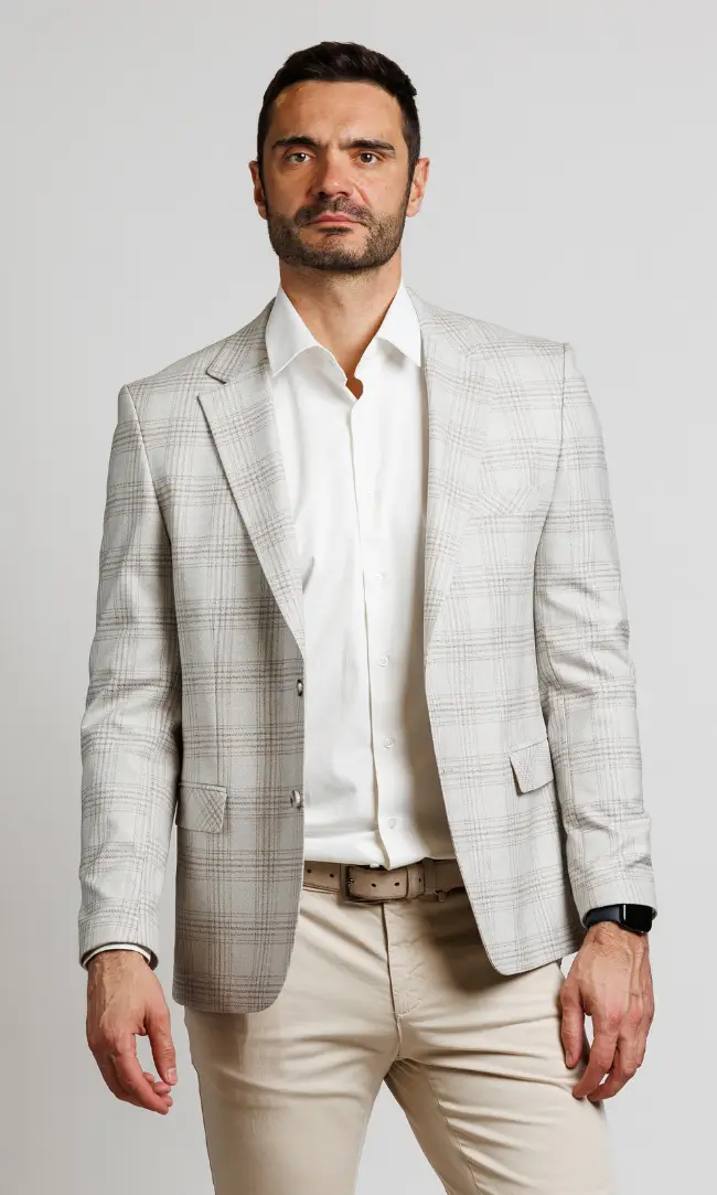 Muški sako u svetlim tonovima sa diskretnim kariranim dezenom – Simbol modernog džentlmena. Lagan, strukiran i dizajniran da pruži maksimalnu eleganciju uz minimalan napor.