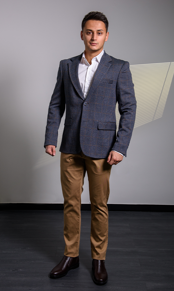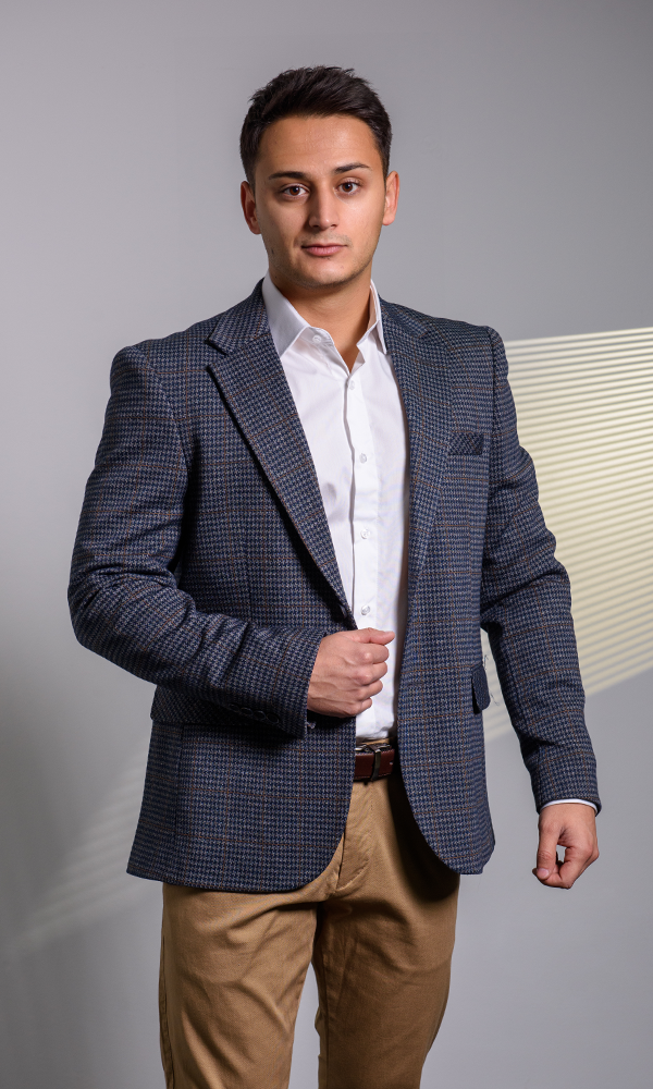 Ovaj sako iz kolekcije ATRIUM FASHION donosi prefinjenu kombinaciju teget i sive boje sa izuzetno sitnim, mikro-kariranim dezenom. Elegantan je i lako se kombinuje, idealan za smart-casual poslovne prilike, ali i večernje izlaske. Bogata tekstura i klasični kroj garantuju besprekoran stil.