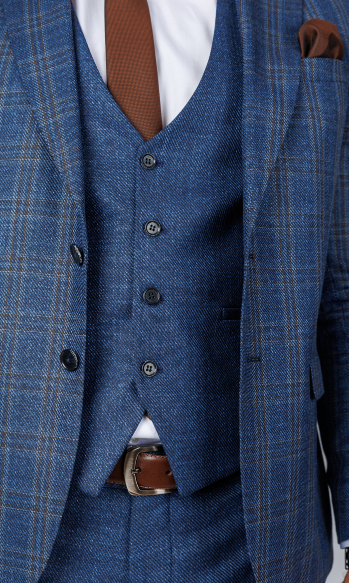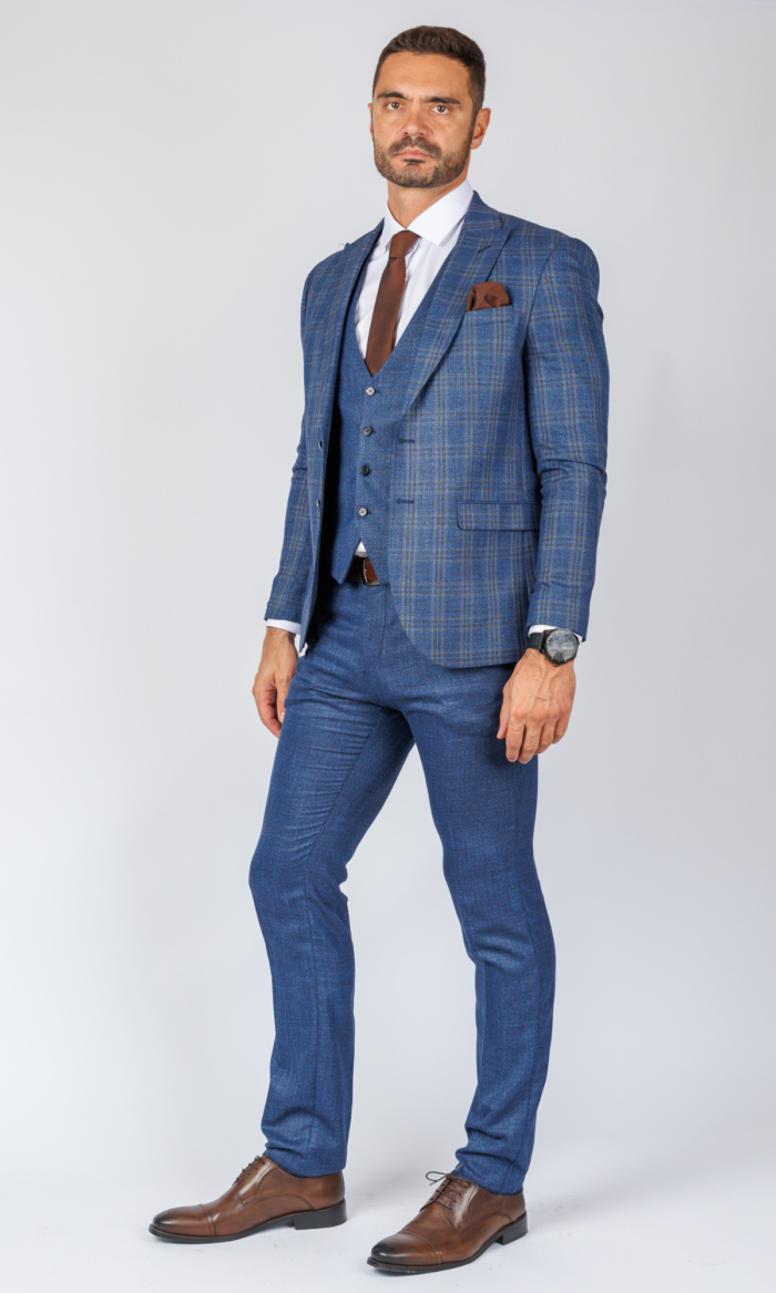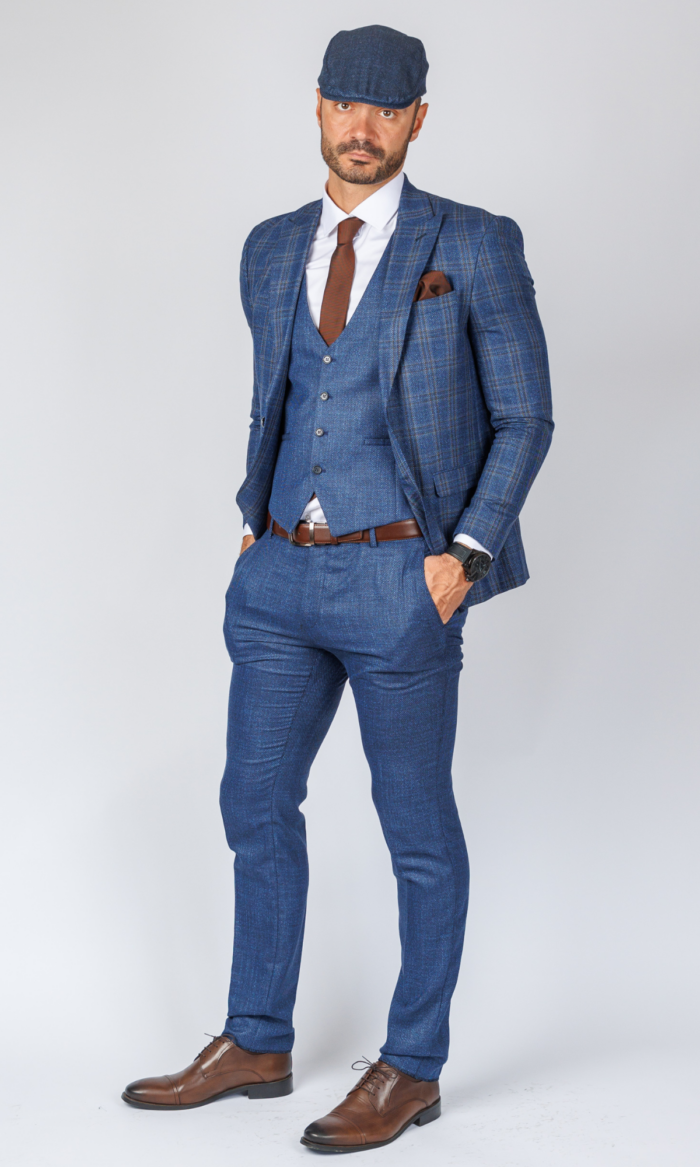 Četvorodelno karirano odelo brenda Atrium Fashion u intenzivno plavoj boji. Komplet sa prslukom i kačketom za besprekoran džentlmenski stil sa karakterom.