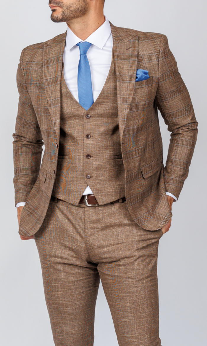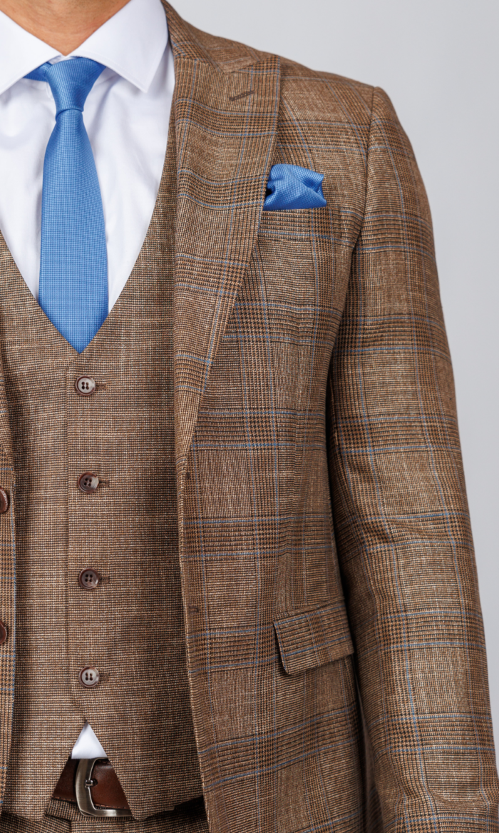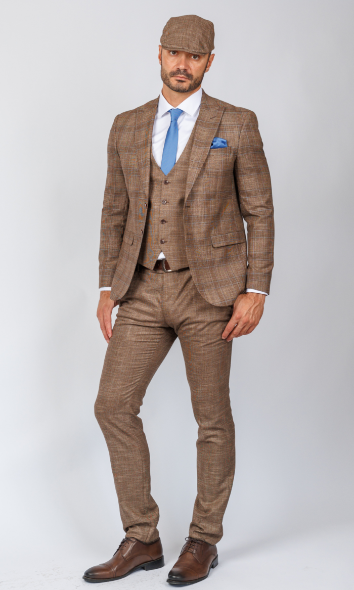 Upečatljivo braon karirano četvorodelno odelo brenda Atrium Fashion. Komplet sa prslukom i kačketom za muškarca koji neguje autentičan i sofisticiran stil.