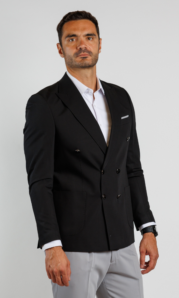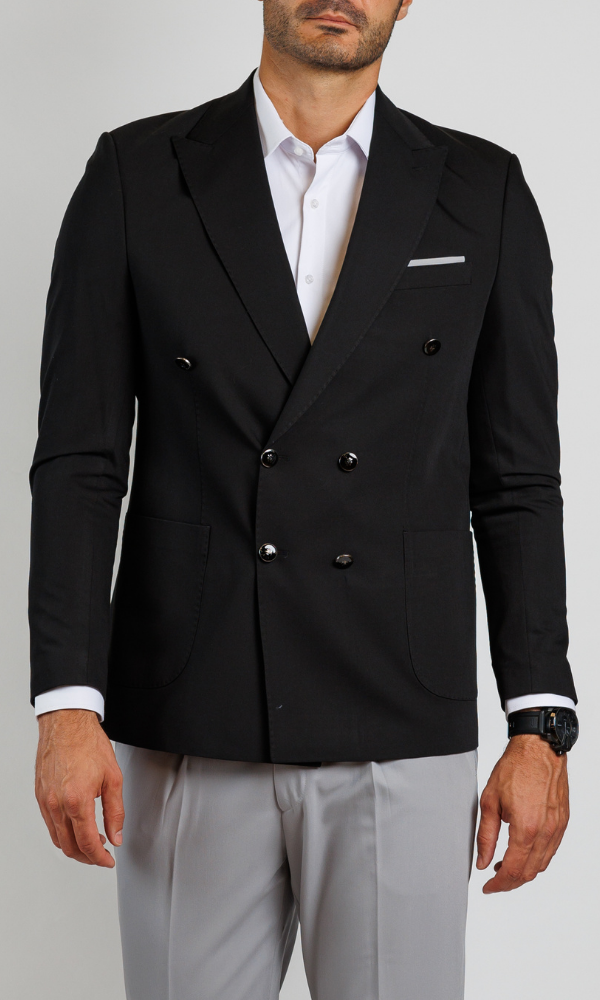 Moderno muško odelo brenda Atrium Fashion u upečatljivoj crno-sivoj kombinaciji. Dvoredno kopčanje i slim-fit kroj za besprekoran stil.