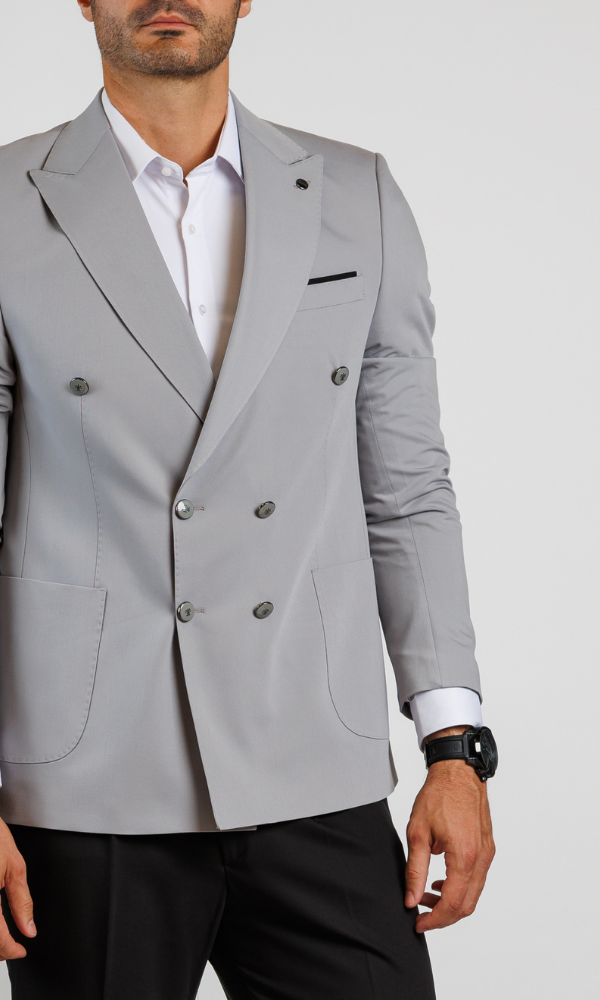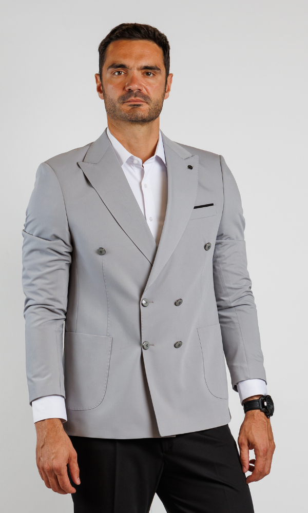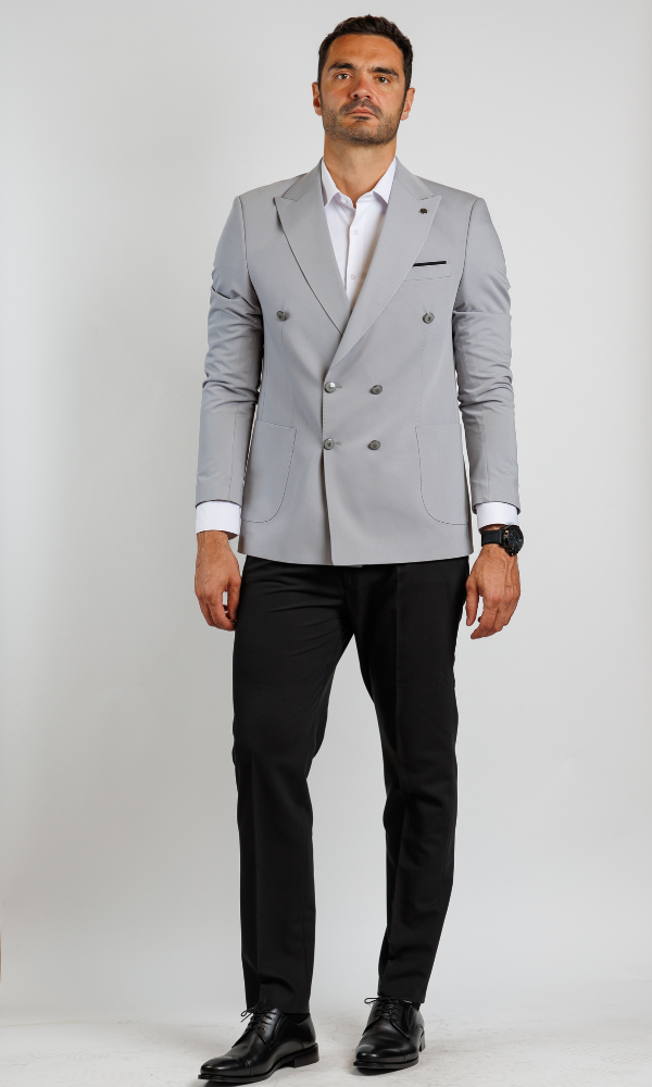 Ekskluzivno muško odelo brenda Atrium Fashion. Savršen spoj svetlosivog dvorednog sakoa i klasičnih crnih pantalona za markantan i moderan poslovni izgled.