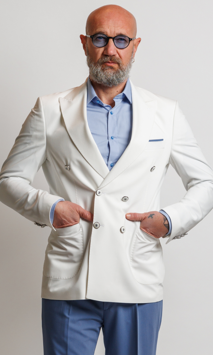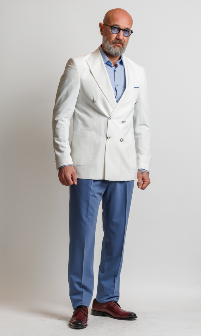 Sveže i luksuzno muško odelo brenda Atrium Fashion. Kombinacija snežno belog dvorednog sakoa i nebo plavih pantalona za upečatljiv letnji stil.