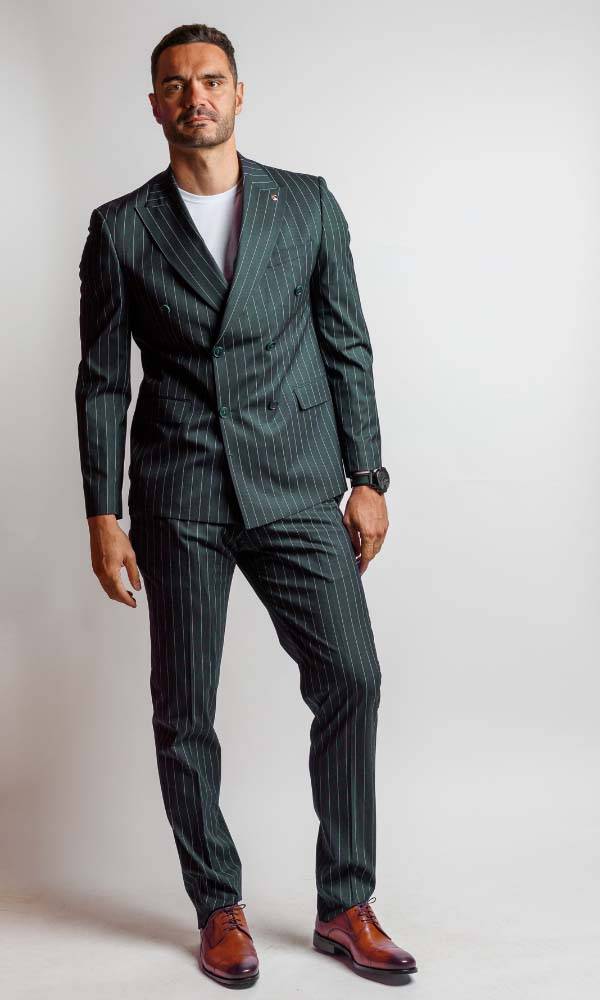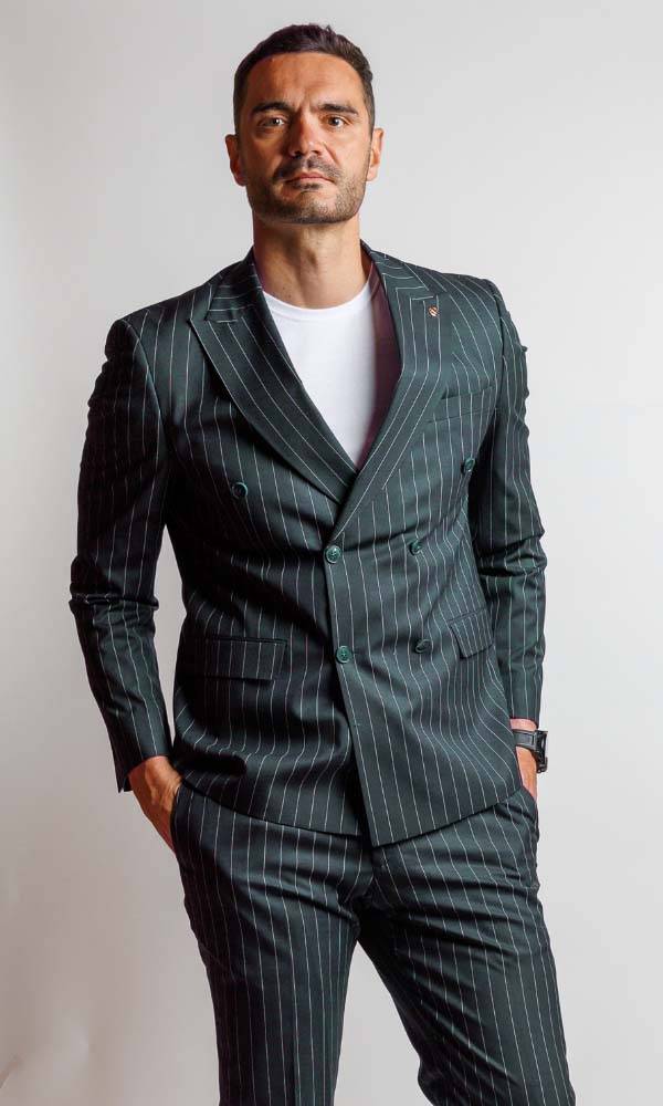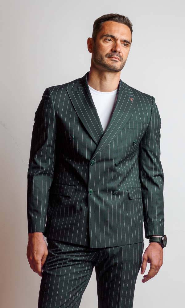 Luksuzno odelo ATRIUM FASHION u tamno zelenoj boji sa diskretnim prugama. Besprekoran dvoredni kroj za muškarca koji diktira trendove.