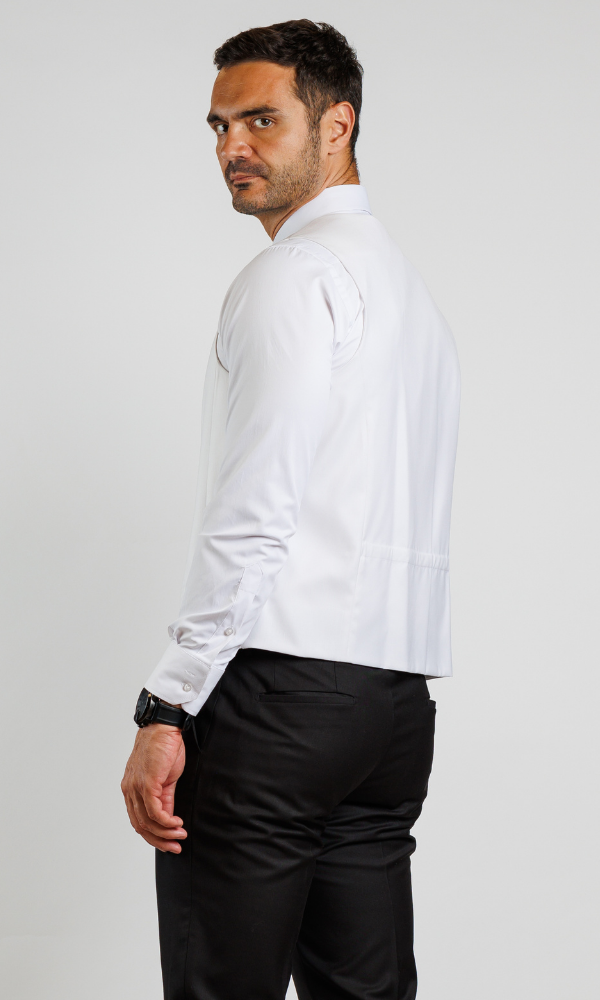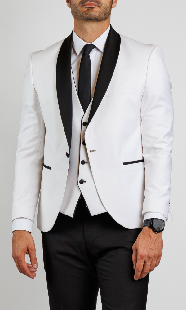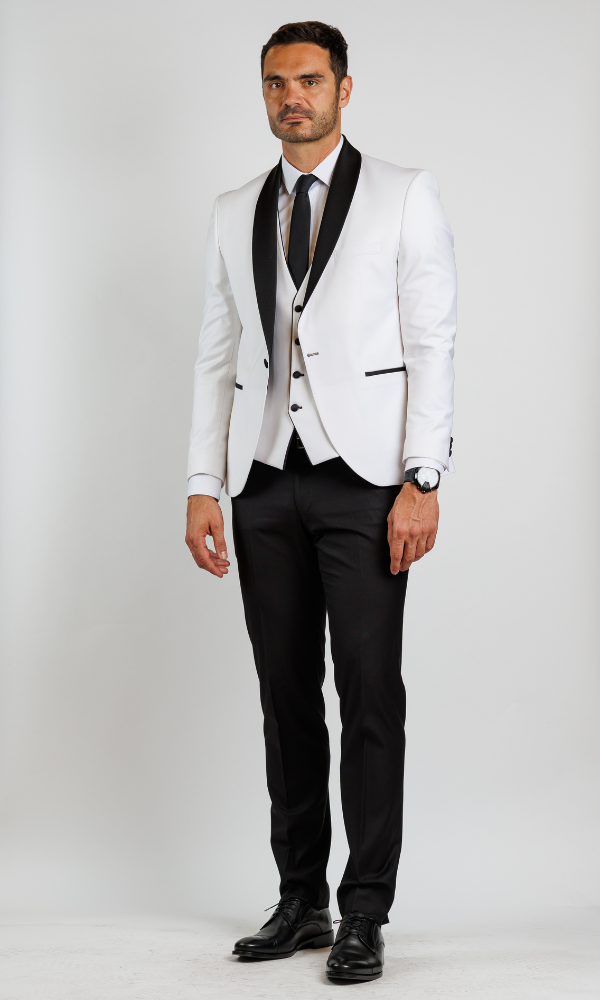 Ekskluzivni beli smoking ATRIUM FASHION sa trodelnim krojem i crnim satenskim reverima. Neprikosnoven izbor za mladoženje koji žele savršenstvo.