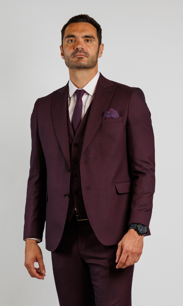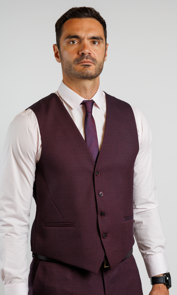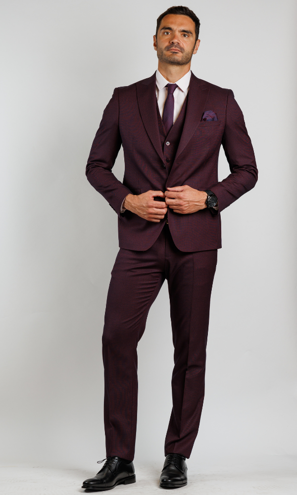Luksuzno bordo muško odelo ATRIUM FASHION sa prslukom. Prefinjen slim-fit kroj koji odiše toplinom i modernom elegancijom.