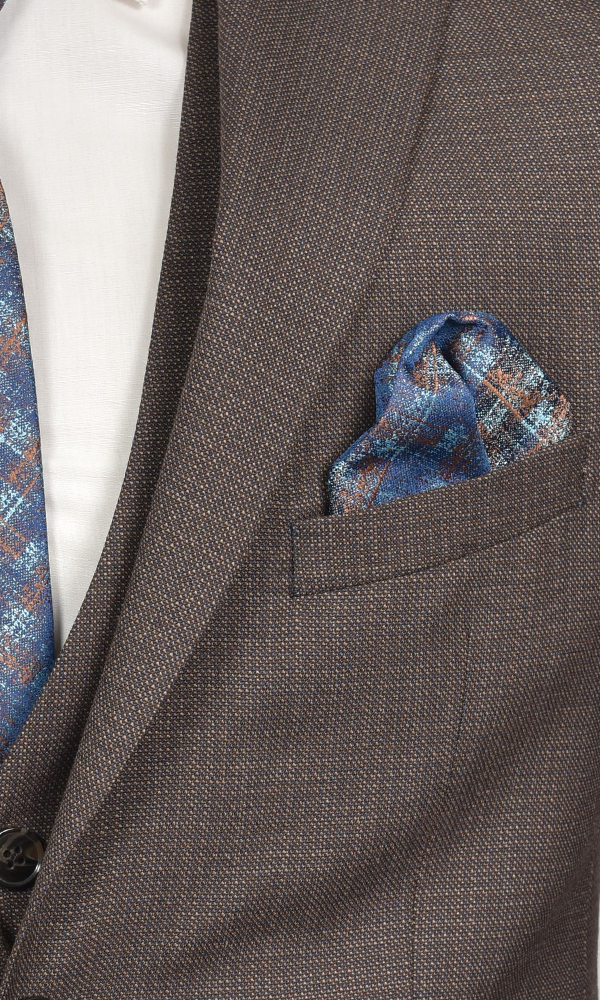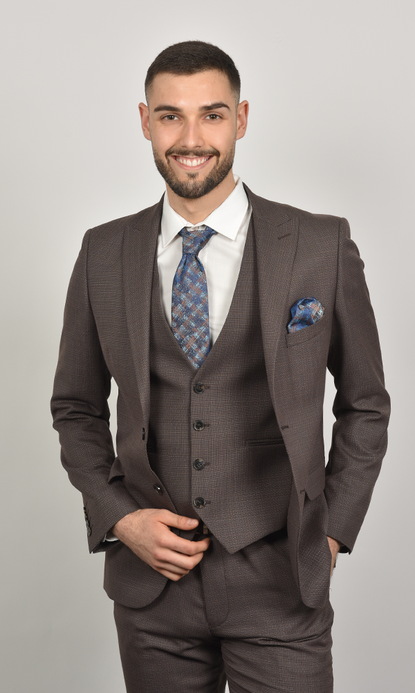 Ekskluzivno muško trodelno odelo brenda Atrium Fashion u bogatoj tamnobraon boji. Prefinjena tekstura i besprekoran kroj sa prslukom za sofisticiran izgled sa karakterom.