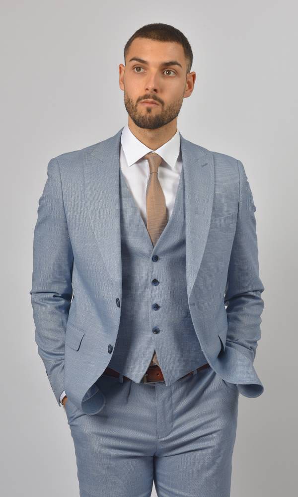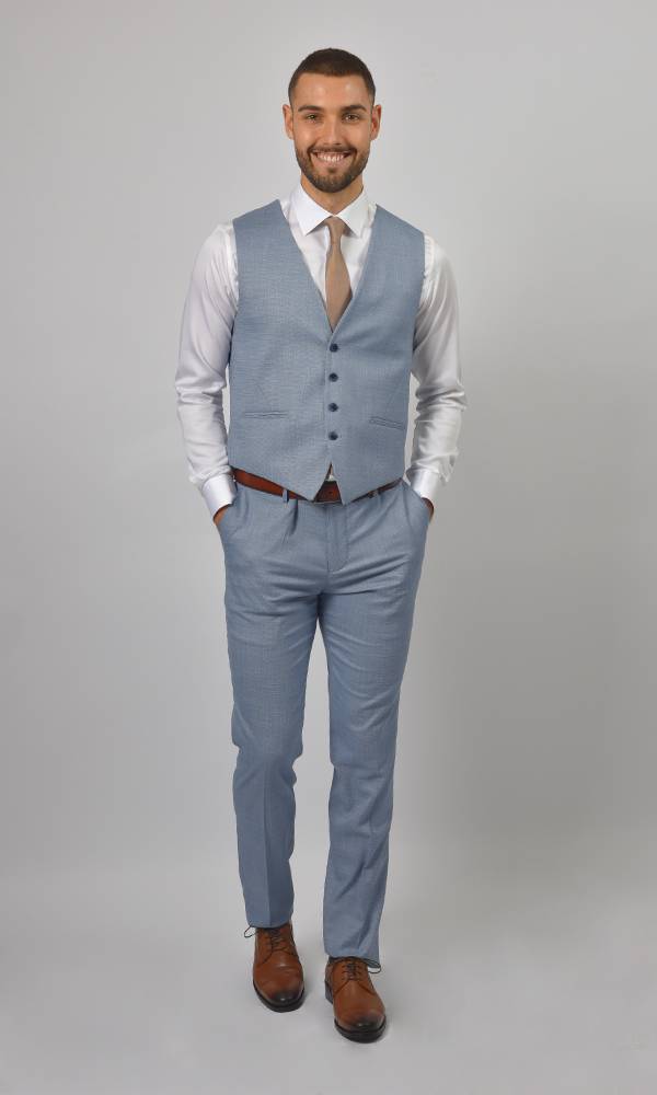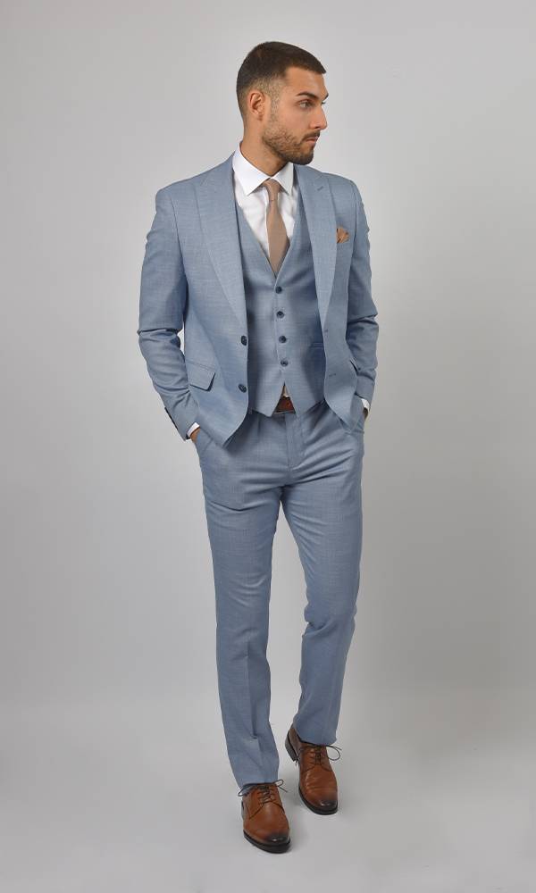 Moderno muško trodelno odelo brenda Atrium Fashion u nežno plavoj boji. Prefinjen kroj sa prslukom koji ističe figuru, idealan za letnje proslave i upečatljiv stil.