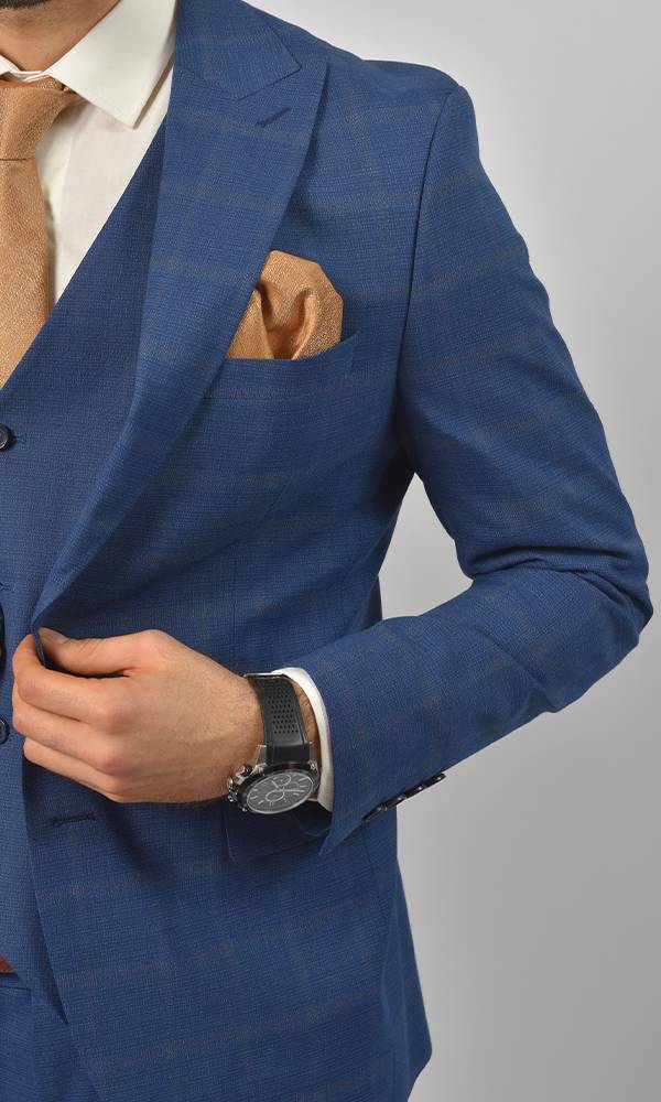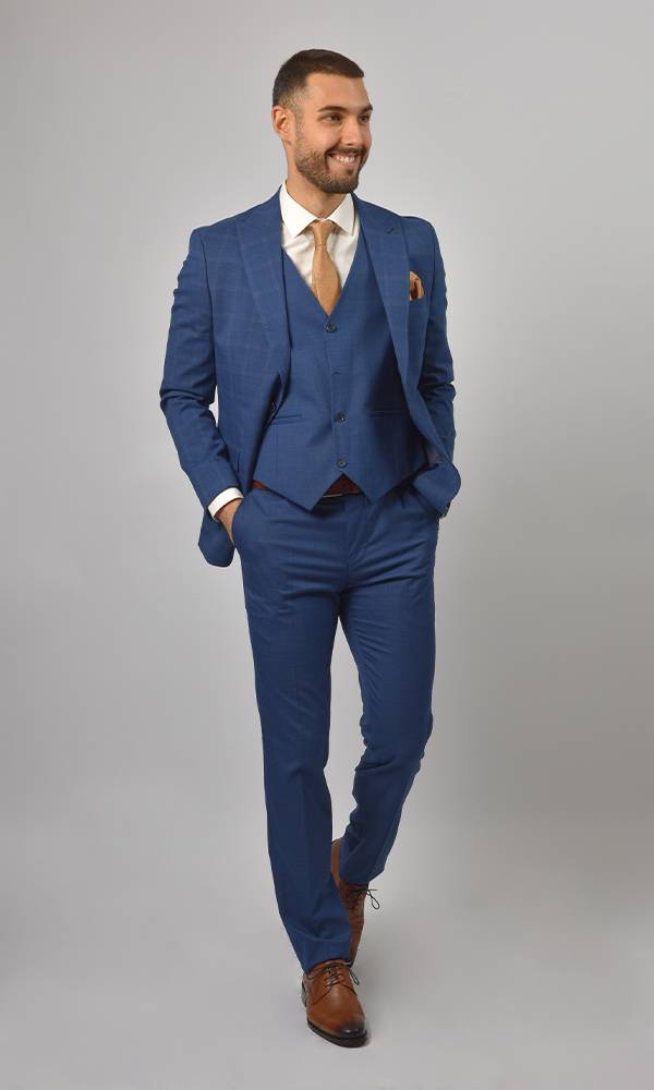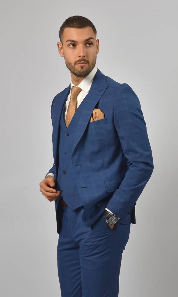 Luksuzno muško trodelno odelo brenda Atrium Fashion u upečatljivoj plavoj boji. Prefinjen karirani dezen i prsluk koji prati liniju tela za besprekoran stil na svim svečanostima.