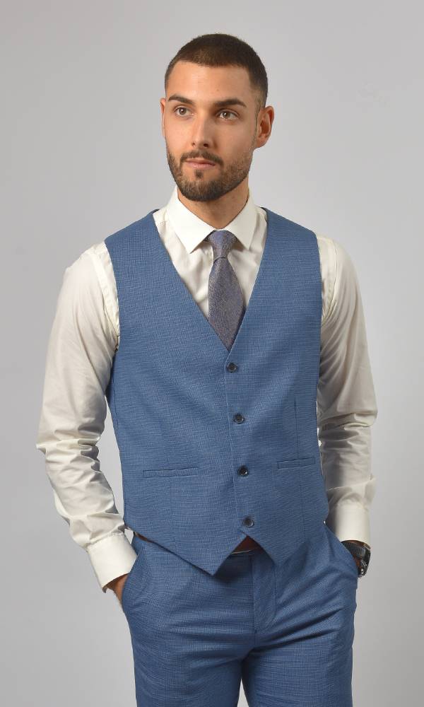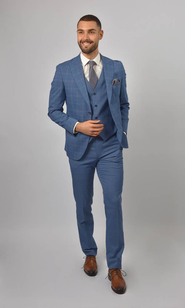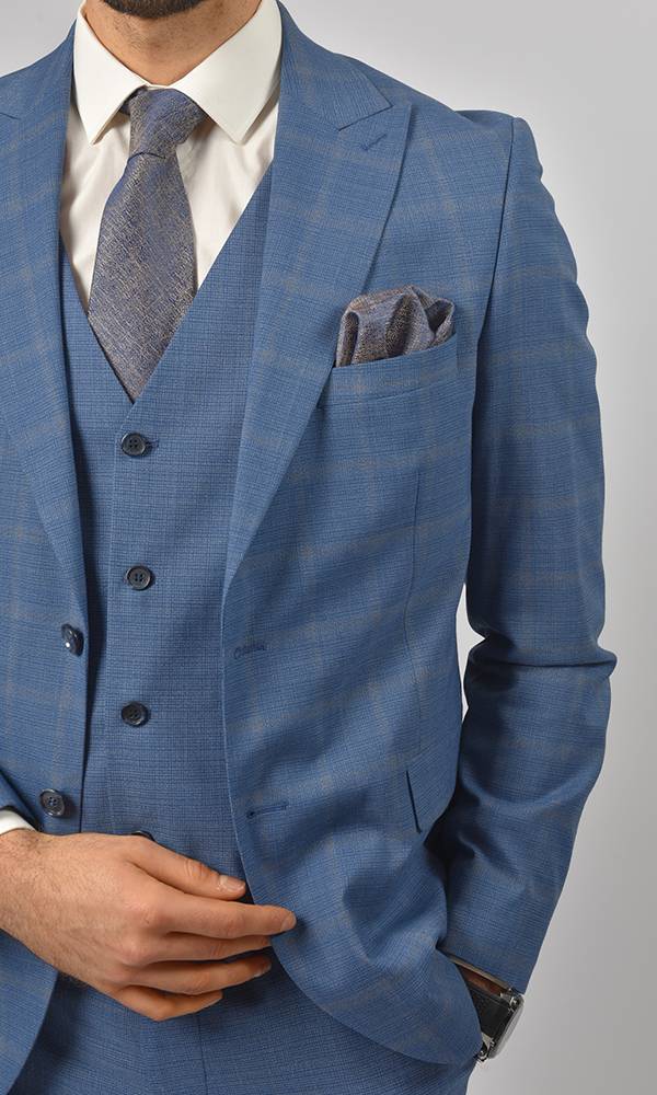 Sofisticirano muško trodelno odelo brenda Atrium Fashion u svetloplavoj boji. Prefinjen karirani dezen i prsluk koji prati liniju tela za izgled koji spaja tradiciju i moderan stil.