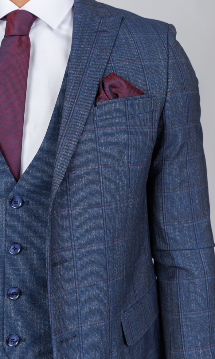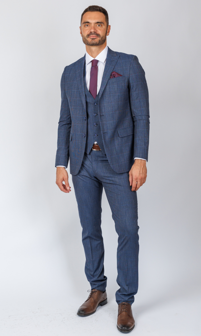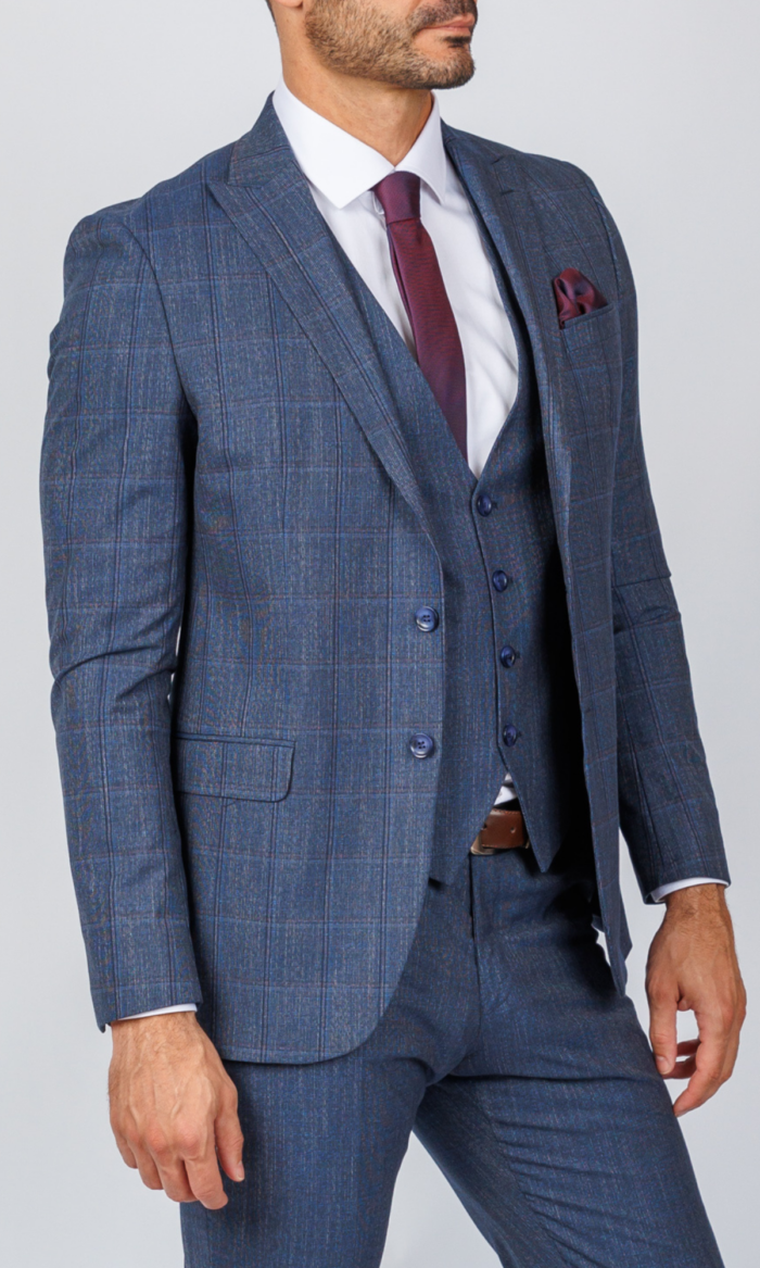 Ekskluzivno muško trodelno odelo u teget boji brenda Atrium Fashion. Prepoznatljiv karirani dezen i vrhunski kroj sa prslukom za maksimalnu eleganciju u najvažnijim prilikama.