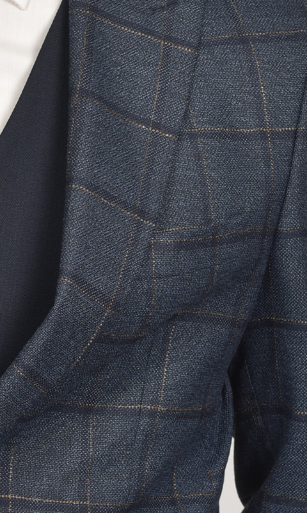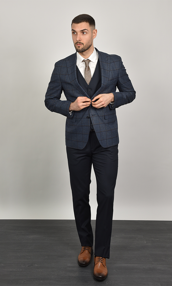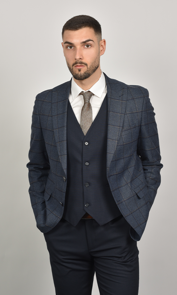 Atraktivno muško trodelno odelo brenda Atrium Fashion sa kontrastnim kariranim sakoom. Savršen spoj teget tonova i modernog dizajna za upečatljiv formalni izgled.